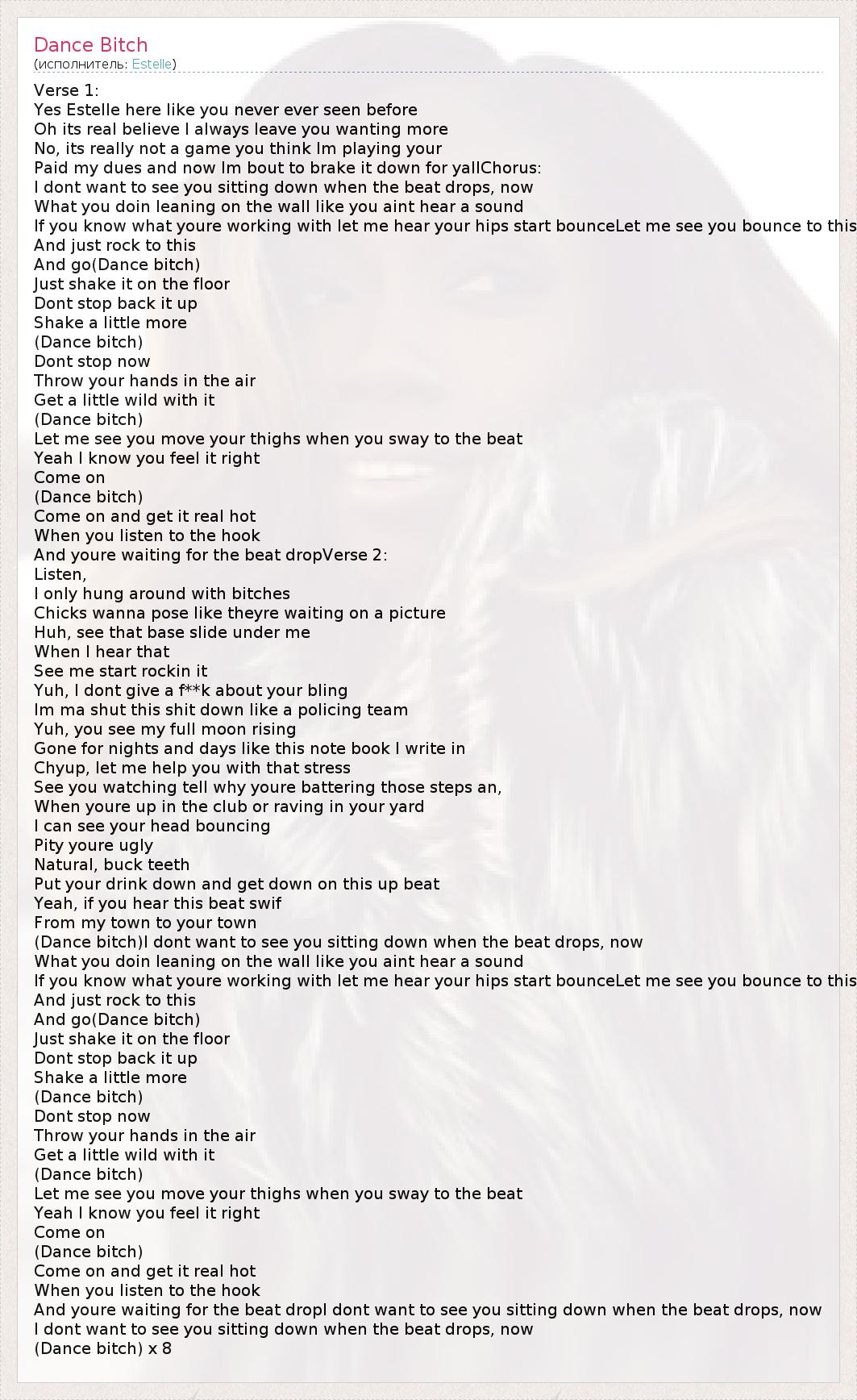 Verse 1: Yes Estelle here like you never ever seen before Oh its real believe I always leave you wanting more No, its really not a game you think Im playing your Paid my dues and now Im bout to brake it down for yallChorus: I dont want to see you sitting down when the beat drops, now What you doin leaning on the wall like you aint hear a sound If you know what youre working with let me hear your hips start bounceLet me see you bounce to this And just rock to this And go(Dance bitch) Just shake it on the floor Dont stop back it up Shake a little more (Dance bitch) Dont stop now Throw your hands in the air Get a little wild with it (Dance bitch) Let me see you move your thighs when you sway to the beat Yeah I know you feel it right Come on (Dance bitch) Come on and get it real hot When you listen to the hook And youre waiting for the beat dropVerse 2: Listen, I only hung around with bitches Chicks wanna pose like theyre waiting on a picture Huh, see that base slide under me When I hear that See me start rockin it Yuh, I dont give a f**k about your bling Im ma shut this shit down like a policing team Yuh, you see my full moon rising Gone for nights and days like this note book I write in Chyup, let me help you with that stress See you watching tell why youre battering those steps an, When youre up in the club or raving in your yard I can see your head bouncing Pity youre ugly Natural, buck teeth Put your drink down and get down on this up beat Yeah, if you hear this beat swif From my town to your town (Dance bitch)I dont want to see you sitting down when the beat drops, now What you doin leaning on the wall like you aint hear a sound If you know what youre working with let me hear your hips start bounceLet me see you bounce to this And just rock to this And go(Dance bitch) Just shake it on the floor Dont stop back it up Shake a little more (Dance bitch) Dont stop now Throw your hands in the air Get a little wild with it (Dance bitch) Let me see you move your thighs when you sway to the beat Yeah I know you feel it right Come on (Dance bitch) Come on and get it real hot When you listen to the hook And youre waiting for the beat dropI dont want to see you sitting down when the beat drops, now I dont want to see you sitting down when the beat drops, now (Dance bitch) x 8