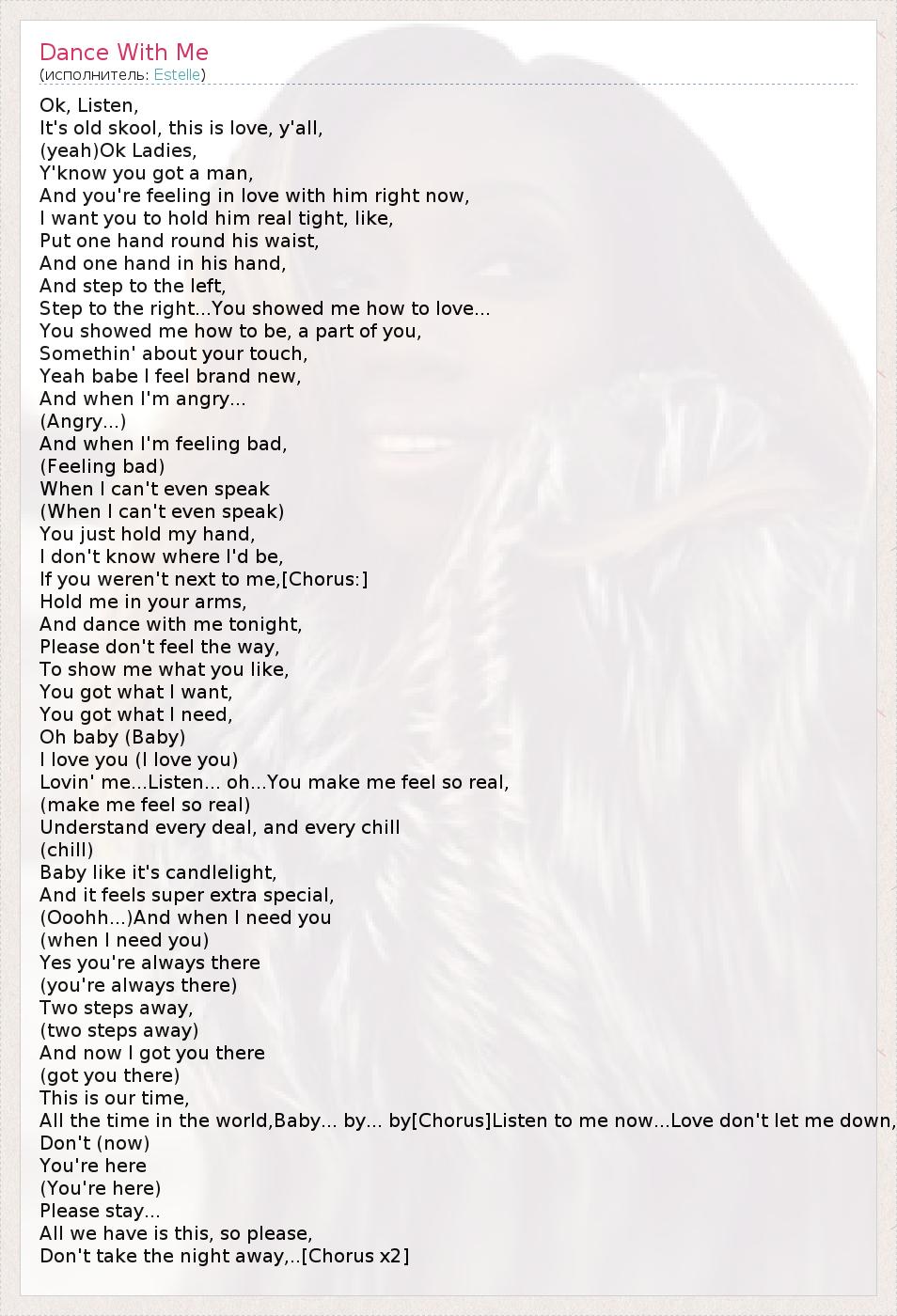 Ok, Listen, It's old skool, this is love, y'all, (yeah)Ok Ladies, Y'know you got a man, And you're feeling in love with him right now, I want you to hold him real tight, like, Put one hand round his waist, And one hand in his hand, And step to the left, Step to the right...You showed me how to love... You showed me how to be, a part of you, Somethin' about your touch, Yeah babe I feel brand new, And when I'm angry... (Angry...) And when I'm feeling bad, (Feeling bad) When I can't even speak (When I can't even speak) You just hold my hand, I don't know where I'd be, If you weren't next to me,[Chorus:] Hold me in your arms, And dance with me tonight, Please don't feel the way, To show me what you like, You got what I want, You got what I need, Oh baby (Baby) I love you (I love you) Lovin' me...Listen... oh...You make me feel so real, (make me feel so real) Understand every deal, and every chill (chill) Baby like it's candlelight, And it feels super extra special, (Ooohh...)And when I need you (when I need you) Yes you're always there (you're always there) Two steps away, (two steps away) And now I got you there (got you there) This is our time, All the time in the world,Baby... by... by[Chorus]Listen to me now...Love don't let me down, Don't (now) You're here (You're here) Please stay... All we have is this, so please, Don't take the night away,..[Chorus x2]