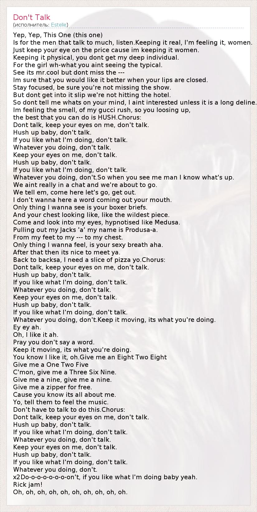 Yep, Yep, This One (this one) Is for the men that talk to much, listen.Keeping it real, I'm feeling it, women. Just keep your eye on the price cause im keeping it women. Keeping it physical, you dont get my deep individual. For the girl wh-what you aint seeing the typical. See its mr.cool but dont miss the --- Im sure that you would like it better when your lips are closed. Stay focused, be sure you're not missing the show. But dont get into it slip we're not hitting the hotel. So dont tell me whats on your mind, I aint interested unless it is a long deline. Im feeling the smell, of my gucci rush, so you loosing up, the best that you can do is HUSH.Chorus: Dont talk, keep your eyes on me, don't talk. Hush up baby, don't talk. If you like what I'm doing, don't talk. Whatever you doing, don't talk. Keep your eyes on me, don't talk. Hush up baby, don't talk. If you like what I'm doing, don't talk. Whatever you doing, don't.So when you see me man I know what's up. We aint really in a chat and we're about to go. We tell em, come here let's go, get out. I don't wanna here a word coming out your mouth. Only thing I wanna see is your boxer briefs. And your chest looking like, like the wildest piece. Come and look into my eyes, hypnotised like Medusa. Pulling out my Jacks 'a' my name is Produsa-a. From my feet to my --- to my chest. Only thing I wanna feel, is your sexy breath aha. After that then its nice to meet ya. Back to backsa, I need a slice of pizza yo.Chorus: Dont talk, keep your eyes on me, don't talk. Hush up baby, don't talk. If you like what I'm doing, don't talk. Whatever you doing, don't talk. Keep your eyes on me, don't talk. Hush up baby, don't talk. If you like what I'm doing, don't talk. Whatever you doing, don't.Keep it moving, its what you're doing. Ey ey ah. Oh, I like it ah. Pray you don't say a word. Keep it moving, its what you're doing. You know I like it, oh.Give me an Eight Two Eight Give me a One Two Five C'mon, give me a Three Six Nine. Give me a nine, give me a nine. Give me a zipper for free. Cause you know its all about me. Yo, tell them to feel the music. Don't have to talk to do this.Chorus: Dont talk, keep your eyes on me, don't talk. Hush up baby, don't talk. If you like what I'm doing, don't talk. Whatever you doing, don't talk. Keep your eyes on me, don't talk. Hush up baby, don't talk. If you like what I'm doing, don't talk. Whatever you doing, don't. x2Do-o-o-o-o-o-o-on't, if you like what I'm doing baby yeah. Rick jam! Oh, oh, oh, oh, oh, oh, oh, oh, oh, oh.