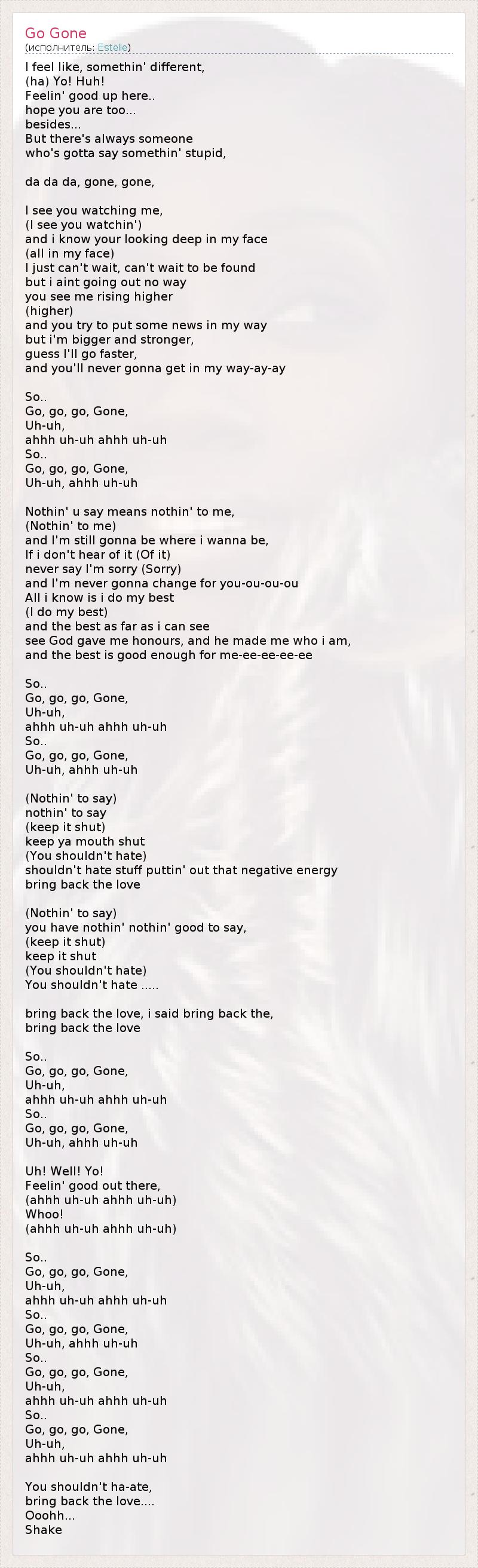 I feel like, somethin' different, (ha) Yo! Huh! Feelin' good up here.. hope you are too... besides... But there's always someone who's gotta say somethin' stupid, da da da, gone, gone, I see you watching me, (I see you watchin') and i know your looking deep in my face (all in my face) I just can't wait, can't wait to be found but i aint going out no way you see me rising higher (higher) and you try to put some news in my way but i'm bigger and stronger, guess I'll go faster, and you'll never gonna get in my way-ay-ay So.. Go, go, go, Gone, Uh-uh, ahhh uh-uh ahhh uh-uh So.. Go, go, go, Gone, Uh-uh, ahhh uh-uh Nothin' u say means nothin' to me, (Nothin' to me) and I'm still gonna be where i wanna be, If i don't hear of it (Of it) never say I'm sorry (Sorry) and I'm never gonna change for you-ou-ou-ou All i know is i do my best (I do my best) and the best as far as i can see see God gave me honours, and he made me who i am, and the best is good enough for me-ee-ee-ee-ee So.. Go, go, go, Gone, Uh-uh, ahhh uh-uh ahhh uh-uh So.. Go, go, go, Gone, Uh-uh, ahhh uh-uh (Nothin' to say) nothin' to say (keep it shut) keep ya mouth shut (You shouldn't hate) shouldn't hate stuff puttin' out that negative energy bring back the love (Nothin' to say) you have nothin' nothin' good to say, (keep it shut) keep it shut (You shouldn't hate) You shouldn't hate ..... bring back the love, i said bring back the, bring back the love So.. Go, go, go, Gone, Uh-uh, ahhh uh-uh ahhh uh-uh So.. Go, go, go, Gone, Uh-uh, ahhh uh-uh Uh! Well! Yo! Feelin' good out there, (ahhh uh-uh ahhh uh-uh) Whoo! (ahhh uh-uh ahhh uh-uh) So.. Go, go, go, Gone, Uh-uh, ahhh uh-uh ahhh uh-uh So.. Go, go, go, Gone, Uh-uh, ahhh uh-uh So.. Go, go, go, Gone, Uh-uh, ahhh uh-uh ahhh uh-uh So.. Go, go, go, Gone, Uh-uh, ahhh uh-uh ahhh uh-uh You shouldn't ha-ate, bring back the love.... Ooohh... Shake