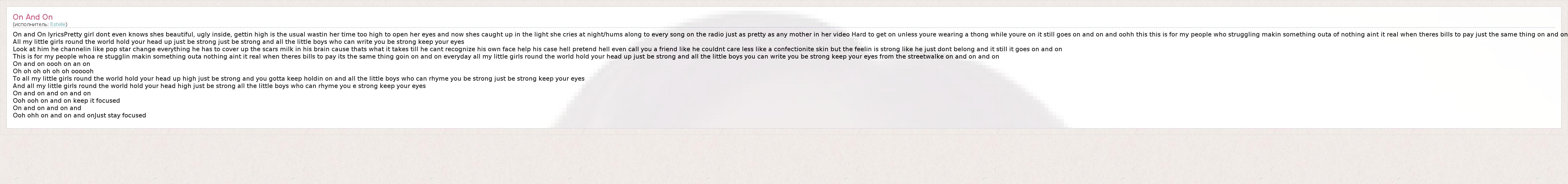 On and On lyricsPretty girl dont even knows shes beautiful, ugly inside, gettin high is the usual wastin her time too high to open her eyes and now shes caught up in the light she cries at night/hums along to every song on the radio just as pretty as any mother in her video Hard to get on unless youre wearing a thong while youre on it still goes on and on and oohh this this is for my people who struggling makin something outa of nothing aint it real when theres bills to pay just the same thing on and on All my little girls round the world hold your head up just be strong just be strong and all the little boys who can write you be strong keep your eyes Look at him he channelin like pop star change everything he has to cover up the scars milk in his brain cause thats what it takes till he cant recognize his own face help his case hell pretend hell even call you a friend like he couldnt care less like a confectionite skin but the feelin is strong like he just dont belong and it still it goes on and on This is for my people whoa re stugglin makin something outa nothing aint it real when theres bills to pay its the same thing goin on and on everyday all my little girls round the world hold your head up just be strong and all the little boys you can write you be strong keep your eyes from the streetwalke on and on and on On and on oooh on an on Oh oh oh oh oh oh oooooh To all my little girls round the world hold your head up high just be strong and you gotta keep holdin on and all the little boys who can rhyme you be strong just be strong keep your eyes And all my little girls round the world hold your head high just be strong all the little boys who can rhyme you e strong keep your eyes On and on and on and on Ooh ooh on and on keep it focused On and on and on and Ooh ohh on and on and onJust stay focused