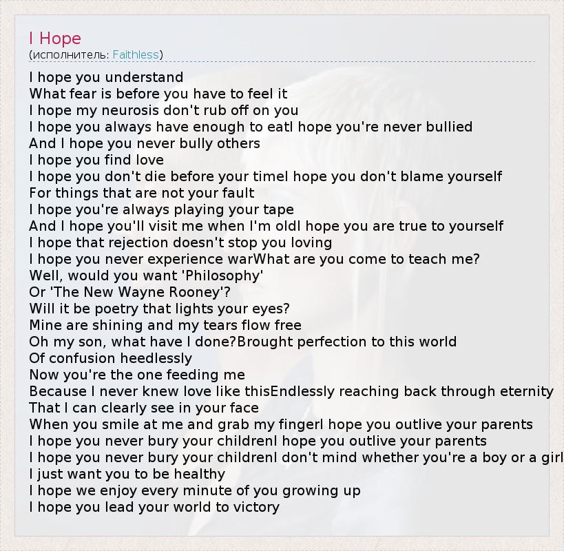 I hope you understand What fear is before you have to feel it I hope my neurosis don't rub off on you I hope you always have enough to eatI hope you're never bullied And I hope you never bully others I hope you find love I hope you don't die before your timeI hope you don't blame yourself For things that are not your fault I hope you're always playing your tape And I hope you'll visit me when I'm oldI hope you are true to yourself I hope that rejection doesn't stop you loving I hope you never experience warWhat are you come to teach me? Well, would you want 'Philosophy' Or 'The New Wayne Rooney'? Will it be poetry that lights your eyes? Mine are shining and my tears flow free Oh my son, what have I done?Brought perfection to this world Of confusion heedlessly Now you're the one feeding me Because I never knew love like thisEndlessly reaching back through eternity That I can clearly see in your face When you smile at me and grab my fingerI hope you outlive your parents I hope you never bury your childrenI hope you outlive your parents I hope you never bury your childrenI don't mind whether you're a boy or a girl I just want you to be healthy I hope we enjoy every minute of you growing up I hope you lead your world to victory