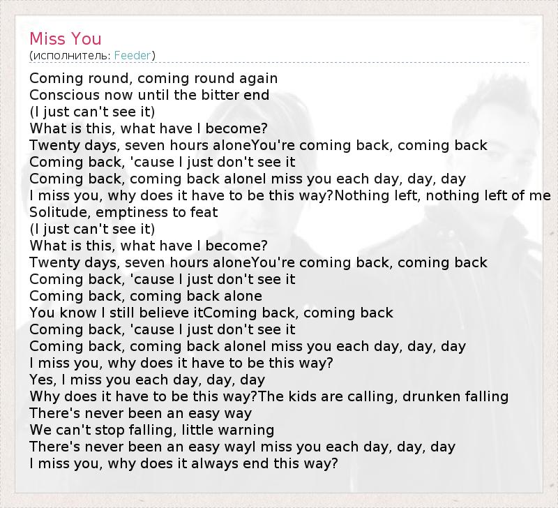 Coming round, coming round again Conscious now until the bitter end (I just can't see it) What is this, what have I become? Twenty days, seven hours aloneYou're coming back, coming back Coming back, 'cause I just don't see it Coming back, coming back aloneI miss you each day, day, day I miss you, why does it have to be this way?Nothing left, nothing left of me Solitude, emptiness to feat (I just can't see it) What is this, what have I become? Twenty days, seven hours aloneYou're coming back, coming back Coming back, 'cause I just don't see it Coming back, coming back alone You know I still believe itComing back, coming back Coming back, 'cause I just don't see it Coming back, coming back aloneI miss you each day, day, day I miss you, why does it have to be this way? Yes, I miss you each day, day, day Why does it have to be this way?The kids are calling, drunken falling There's never been an easy way We can't stop falling, little warning There's never been an easy wayI miss you each day, day, day I miss you, why does it always end this way?