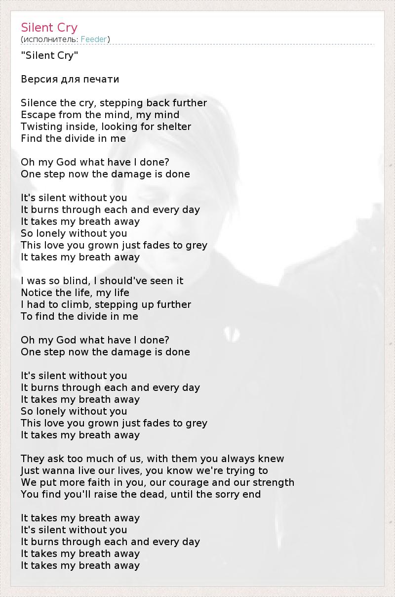 "Silent Cry" Версия для печати Silence the cry, stepping back further Escape from the mind, my mind Twisting inside, looking for shelter Find the divide in me Oh my God what have I done? One step now the damage is done It's silent without you It burns through each and every day It takes my breath away So lonely without you This love you grown just fades to grey It takes my breath away I was so blind, I should've seen it Notice the life, my life I had to climb, stepping up further To find the divide in me Oh my God what have I done? One step now the damage is done It's silent without you It burns through each and every day It takes my breath away So lonely without you This love you grown just fades to grey It takes my breath away They ask too much of us, with them you always knew Just wanna live our lives, you know we're trying to We put more faith in you, our courage and our strength You find you'll raise the dead, until the sorry end It takes my breath away It's silent without you It burns through each and every day It takes my breath away It takes my breath away