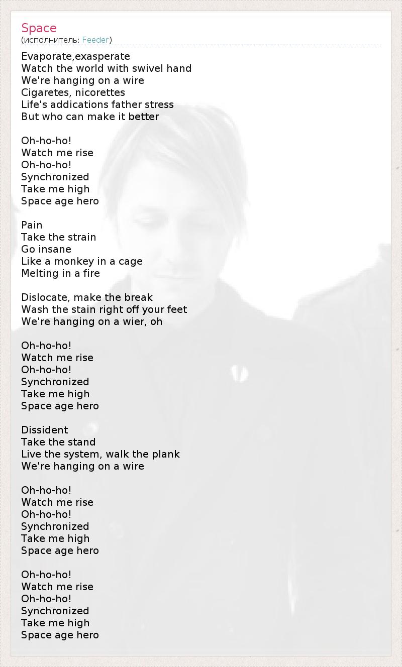 Evaporate,exasperate Watch the world with swivel hand We're hanging on a wire Cigaretes, nicorettes Life's addications father stress But who can make it better Oh-ho-ho! Watch me rise Oh-ho-ho! Synchronized Take me high Space age hero Pain Take the strain Go insane Like a monkey in a cage Melting in a fire Dislocate, make the break Wash the stain right off your feet We're hanging on a wier, oh Oh-ho-ho! Watch me rise Oh-ho-ho! Synchronized Take me high Space age hero Dissident Take the stand Live the system, walk the plank We're hanging on a wire Oh-ho-ho! Watch me rise Oh-ho-ho! Synchronized Take me high Space age hero Oh-ho-ho! Watch me rise Oh-ho-ho! Synchronized Take me high Space age hero
