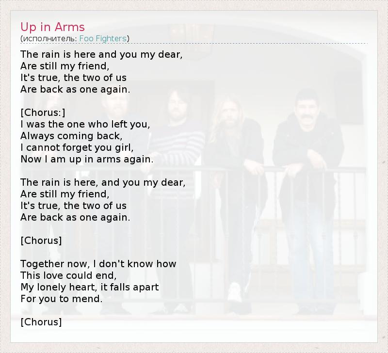 The rain is here and you my dear, Are still my friend, It's true, the two of us Are back as one again. [Chorus:] I was the one who left you, Always coming back, I cannot forget you girl, Now I am up in arms again. The rain is here, and you my dear, Are still my friend, It's true, the two of us Are back as one again. [Chorus] Together now, I don't know how This love could end, My lonely heart, it falls apart For you to mend. [Chorus]
