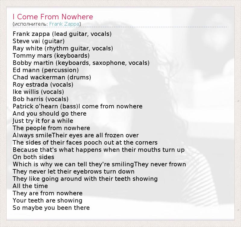 Frank zappa (lead guitar, vocals) Steve vai (guitar) Ray white (rhythm guitar, vocals) Tommy mars (keyboards) Bobby martin (keyboards, saxophone, vocals) Ed mann (percussion) Chad wackerman (drums) Roy estrada (vocals) Ike willis (vocals) Bob harris (vocals) Patrick o'hearn (bass)I come from nowhere And you should go there Just try it for a while The people from nowhere Always smileTheir eyes are all frozen over The sides of their faces pooch out at the corners Because that's what happens when their mouths turn up On both sides Which is why we can tell they're smilingThey never frown They never let their eyebrows turn down They like going around with their teeth showing All the time They are from nowhere Your teeth are showing So maybe you been there
