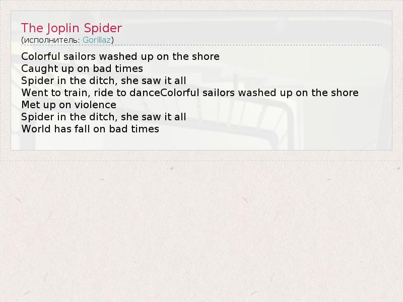 Colorful sailors washed up on the shore Caught up on bad times Spider in the ditch, she saw it all Went to train, ride to danceColorful sailors washed up on the shore Met up on violence Spider in the ditch, she saw it all World has fall on bad times