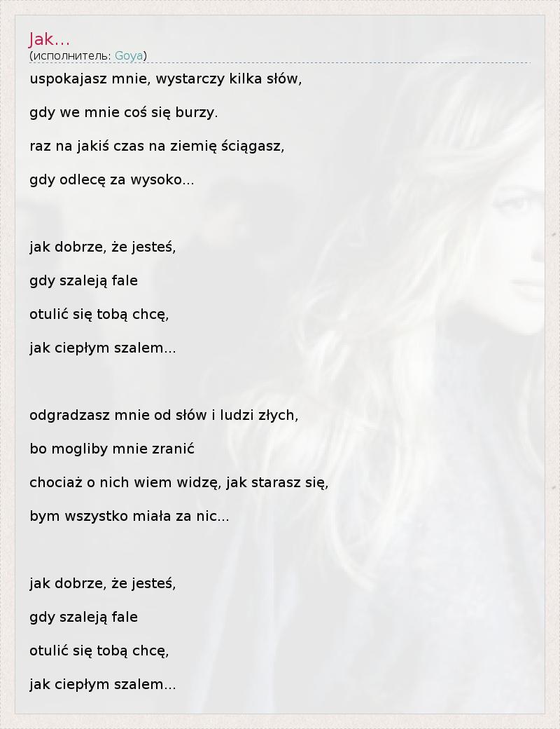uspokajasz mnie, wystarczy kilka słów, gdy we mnie coś się burzy. raz na jakiś czas na ziemię ściągasz, gdy odlecę za wysoko... jak dobrze, że jesteś, gdy szaleją fale otulić się tobą chcę, jak ciepłym szalem... odgradzasz mnie od słów i ludzi złych, bo mogliby mnie zranić chociaż o nich wiem widzę, jak starasz się, bym wszystko miała za nic... jak dobrze, że jesteś, gdy szaleją fale otulić się tobą chcę, jak ciepłym szalem...