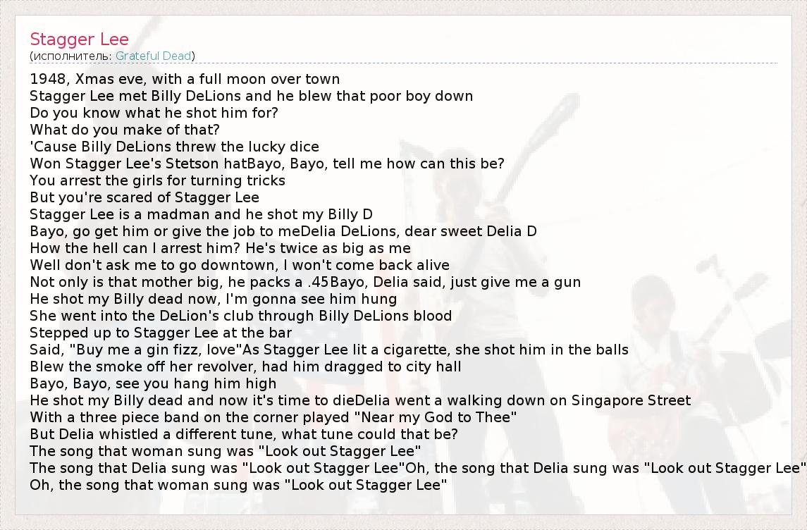 1948, Xmas eve, with a full moon over town Stagger Lee met Billy DeLions and he blew that poor boy down Do you know what he shot him for? What do you make of that? 'Cause Billy DeLions threw the lucky dice Won Stagger Lee's Stetson hatBayo, Bayo, tell me how can this be? You arrest the girls for turning tricks But you're scared of Stagger Lee Stagger Lee is a madman and he shot my Billy D Bayo, go get him or give the job to meDelia DeLions, dear sweet Delia D How the hell can I arrest him? He's twice as big as me Well don't ask me to go downtown, I won't come back alive Not only is that mother big, he packs a .45Bayo, Delia said, just give me a gun He shot my Billy dead now, I'm gonna see him hung She went into the DeLion's club through Billy DeLions blood Stepped up to Stagger Lee at the bar Said, "Buy me a gin fizz, love"As Stagger Lee lit a cigarette, she shot him in the balls Blew the smoke off her revolver, had him dragged to city hall Bayo, Bayo, see you hang him high He shot my Billy dead and now it's time to dieDelia went a walking down on Singapore Street With a three piece band on the corner played "Near my God to Thee" But Delia whistled a different tune, what tune could that be? The song that woman sung was "Look out Stagger Lee" The song that Delia sung was "Look out Stagger Lee"Oh, the song that Delia sung was "Look out Stagger Lee" Oh, the song that woman sung was "Look out Stagger Lee"