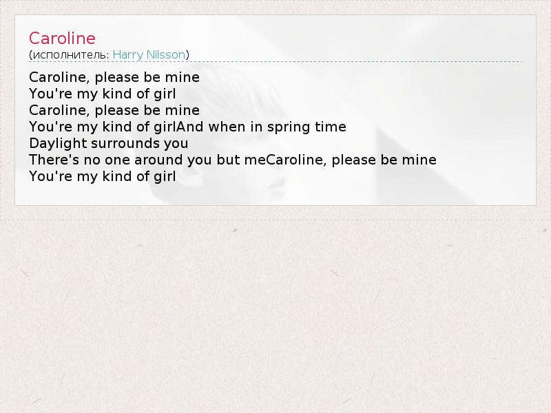 Caroline, please be mine You're my kind of girl Caroline, please be mine You're my kind of girlAnd when in spring time Daylight surrounds you There's no one around you but meCaroline, please be mine You're my kind of girl