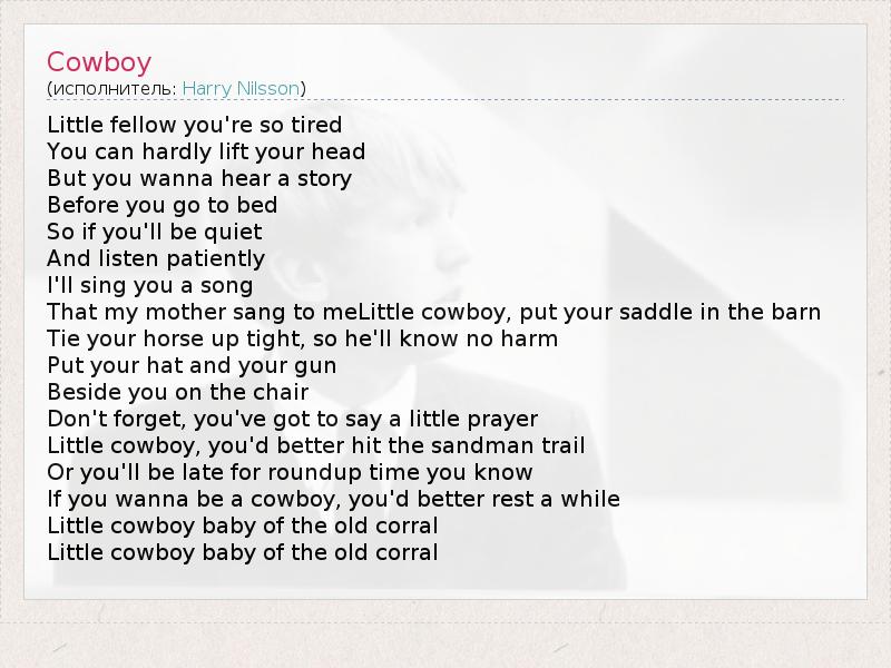 Little fellow you're so tired You can hardly lift your head But you wanna hear a story Before you go to bed So if you'll be quiet And listen patiently I'll sing you a song That my mother sang to meLittle cowboy, put your saddle in the barn Tie your horse up tight, so he'll know no harm Put your hat and your gun Beside you on the chair Don't forget, you've got to say a little prayer Little cowboy, you'd better hit the sandman trail Or you'll be late for roundup time you know If you wanna be a cowboy, you'd better rest a while Little cowboy baby of the old corral Little cowboy baby of the old corral
