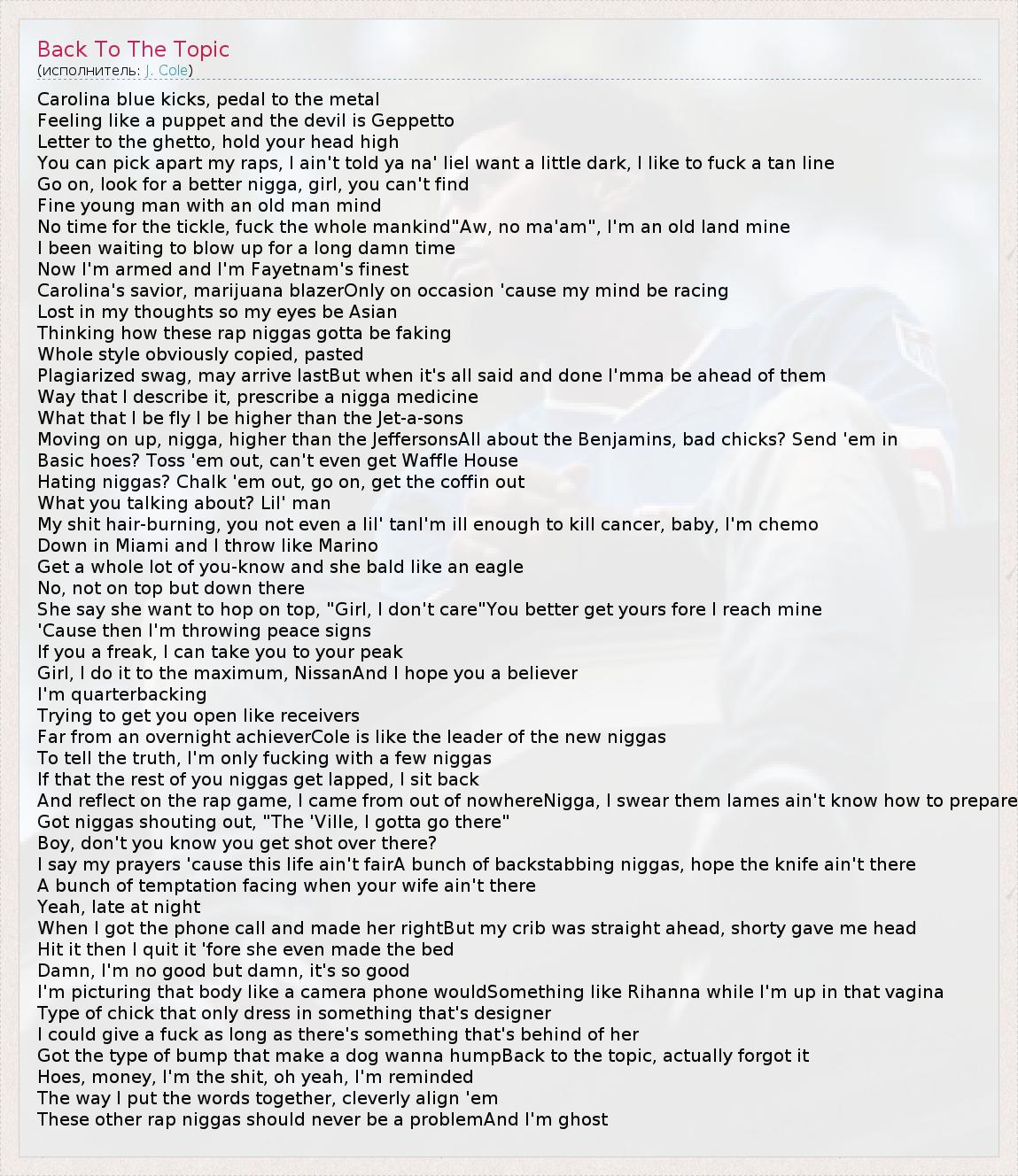 Carolina blue kicks, pedal to the metal Feeling like a puppet and the devil is Geppetto Letter to the ghetto, hold your head high You can pick apart my raps, I ain't told ya na' lieI want a little dark, I like to fuck a tan line Go on, look for a better nigga, girl, you can't find Fine young man with an old man mind No time for the tickle, fuck the whole mankind"Aw, no ma'am", I'm an old land mine I been waiting to blow up for a long damn time Now I'm armed and I'm Fayetnam's finest Carolina's savior, marijuana blazerOnly on occasion 'cause my mind be racing Lost in my thoughts so my eyes be Asian Thinking how these rap niggas gotta be faking Whole style obviously copied, pasted Plagiarized swag, may arrive lastBut when it's all said and done I'mma be ahead of them Way that I describe it, prescribe a nigga medicine What that I be fly I be higher than the Jet-a-sons Moving on up, nigga, higher than the JeffersonsAll about the Benjamins, bad chicks? Send 'em in Basic hoes? Toss 'em out, can't even get Waffle House Hating niggas? Chalk 'em out, go on, get the coffin out What you talking about? Lil' man My shit hair-burning, you not even a lil' tanI'm ill enough to kill cancer, baby, I'm chemo Down in Miami and I throw like Marino Get a whole lot of you-know and she bald like an eagle No, not on top but down there She say she want to hop on top, "Girl, I don't care"You better get yours fore I reach mine 'Cause then I'm throwing peace signs If you a freak, I can take you to your peak Girl, I do it to the maximum, NissanAnd I hope you a believer I'm quarterbacking Trying to get you open like receivers Far from an overnight achieverCole is like the leader of the new niggas To tell the truth, I'm only fucking with a few niggas If that the rest of you niggas get lapped, I sit back And reflect on the rap game, I came from out of nowhereNigga, I swear them lames ain't know how to prepare Got niggas shouting out, "The 'Ville, I gotta go there" Boy, don't you know you get shot over there? I say my prayers 'cause this life ain't fairA bunch of backstabbing niggas, hope the knife ain't there A bunch of temptation facing when your wife ain't there Yeah, late at night When I got the phone call and made her rightBut my crib was straight ahead, shorty gave me head Hit it then I quit it 'fore she even made the bed Damn, I'm no good but damn, it's so good I'm picturing that body like a camera phone wouldSomething like Rihanna while I'm up in that vagina Type of chick that only dress in something that's designer I could give a fuck as long as there's something that's behind of her Got the type of bump that make a dog wanna humpBack to the topic, actually forgot it Hoes, money, I'm the shit, oh yeah, I'm reminded The way I put the words together, cleverly align 'em These other rap niggas should never be a problemAnd I'm ghost