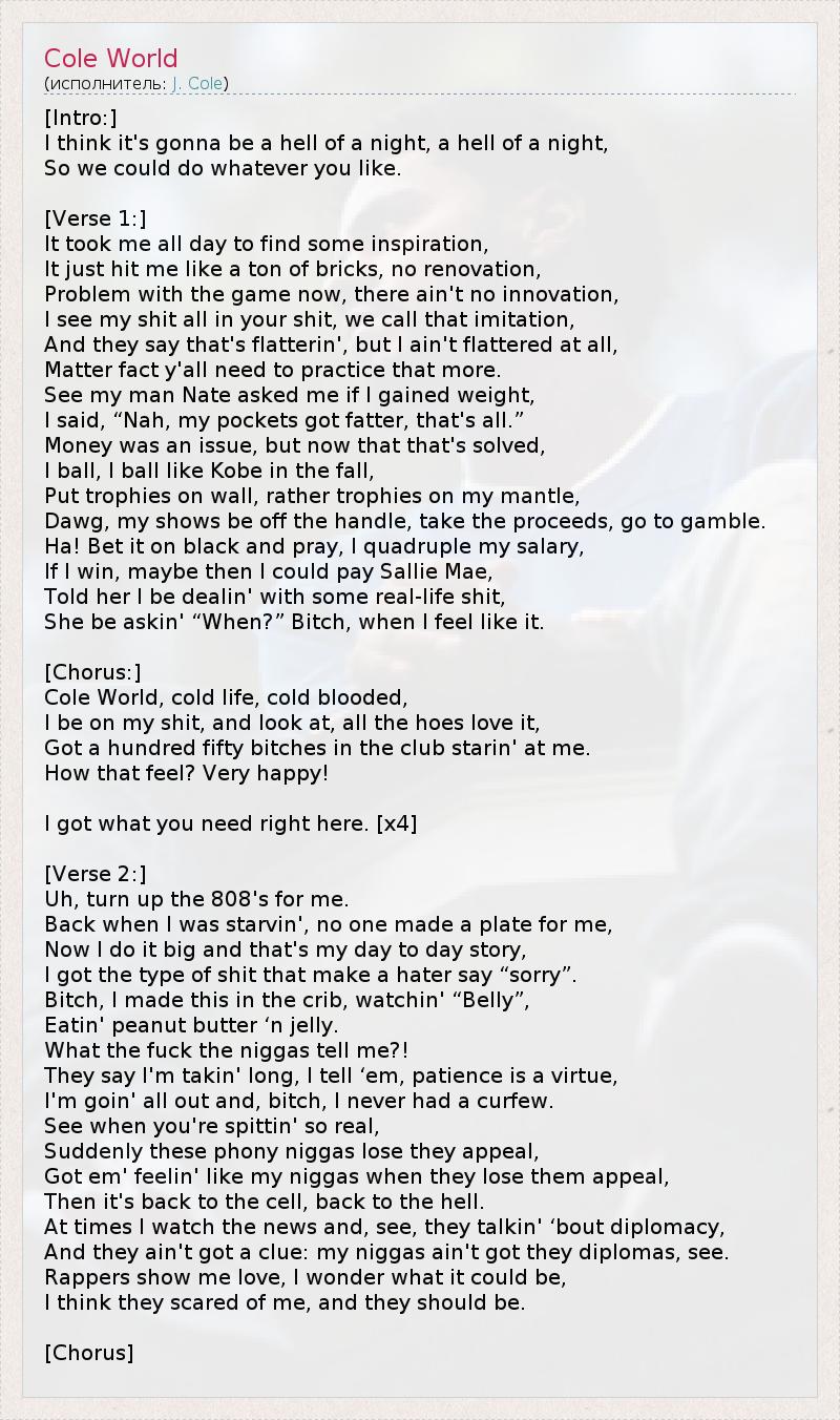 [Intro:] I think it's gonna be a hell of a night, a hell of a night, So we could do whatever you like. [Verse 1:] It took me all day to find some inspiration, It just hit me like a ton of bricks, no renovation, Problem with the game now, there ain't no innovation, I see my shit all in your shit, we call that imitation, And they say that's flatterin', but I ain't flattered at all, Matter fact y'all need to practice that more. See my man Nate asked me if I gained weight, I said, “Nah, my pockets got fatter, that's all.” Money was an issue, but now that that's solved, I ball, I ball like Kobe in the fall, Put trophies on wall, rather trophies on my mantle, Dawg, my shows be off the handle, take the proceeds, go to gamble. Ha! Bet it on black and pray, I quadruple my salary, If I win, maybe then I could pay Sallie Mae, Told her I be dealin' with some real-life shit, She be askin' “When?” Bitch, when I feel like it. [Chorus:] Cole World, cold life, cold blooded, I be on my shit, and look at, all the hoes love it, Got a hundred fifty bitches in the club starin' at me. How that feel? Very happy! I got what you need right here. [x4] [Verse 2:] Uh, turn up the 808's for me. Back when I was starvin', no one made a plate for me, Now I do it big and that's my day to day story, I got the type of shit that make a hater say “sorry”. Bitch, I made this in the crib, watchin' “Belly”, Eatin' peanut butter ‘n jelly. What the fuck the niggas tell me?! They say I'm takin' long, I tell ‘em, patience is a virtue, I'm goin' all out and, bitch, I never had a curfew. See when you're spittin' so real, Suddenly these phony niggas lose they appeal, Got em' feelin' like my niggas when they lose them appeal, Then it's back to the cell, back to the hell. At times I watch the news and, see, they talkin' ‘bout diplomacy, And they ain't got a clue: my niggas ain't got they diplomas, see. Rappers show me love, I wonder what it could be, I think they scared of me, and they should be. [Chorus]