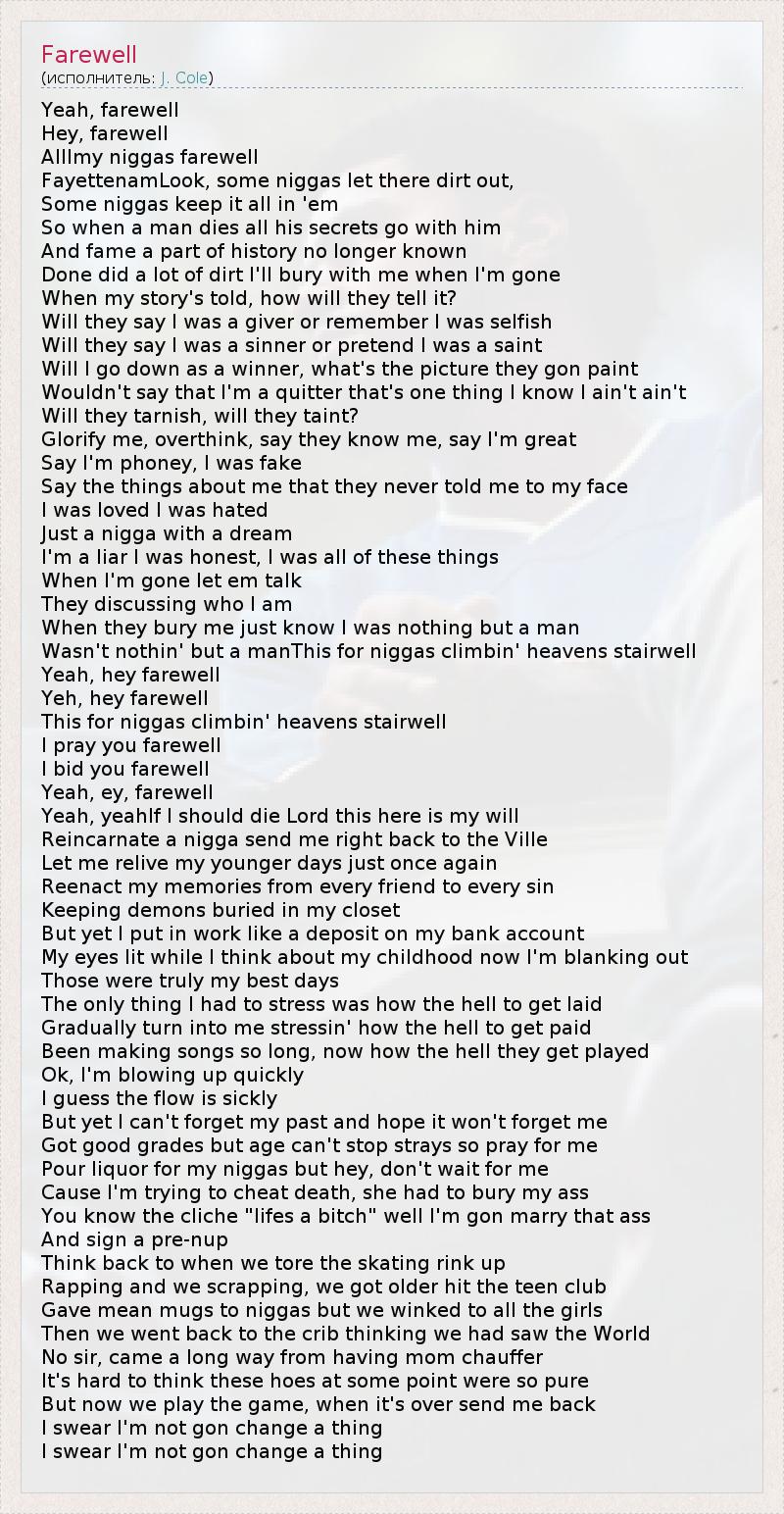 Yeah, farewell Hey, farewell Alllmy niggas farewell FayettenamLook, some niggas let there dirt out, Some niggas keep it all in 'em So when a man dies all his secrets go with him And fame a part of history no longer known Done did a lot of dirt I'll bury with me when I'm gone When my story's told, how will they tell it? Will they say I was a giver or remember I was selfish Will they say I was a sinner or pretend I was a saint Will I go down as a winner, what's the picture they gon paint Wouldn't say that I'm a quitter that's one thing I know I ain't ain't Will they tarnish, will they taint? Glorify me, overthink, say they know me, say I'm great Say I'm phoney, I was fake Say the things about me that they never told me to my face I was loved I was hated Just a nigga with a dream I'm a liar I was honest, I was all of these things When I'm gone let em talk They discussing who I am When they bury me just know I was nothing but a man Wasn't nothin' but a manThis for niggas climbin' heavens stairwell Yeah, hey farewell Yeh, hey farewell This for niggas climbin' heavens stairwell I pray you farewell I bid you farewell Yeah, ey, farewell Yeah, yeahIf I should die Lord this here is my will Reincarnate a nigga send me right back to the Ville Let me relive my younger days just once again Reenact my memories from every friend to every sin Keeping demons buried in my closet But yet I put in work like a deposit on my bank account My eyes lit while I think about my childhood now I'm blanking out Those were truly my best days The only thing I had to stress was how the hell to get laid Gradually turn into me stressin' how the hell to get paid Been making songs so long, now how the hell they get played Ok, I'm blowing up quickly I guess the flow is sickly But yet I can't forget my past and hope it won't forget me Got good grades but age can't stop strays so pray for me Pour liquor for my niggas but hey, don't wait for me Cause I'm trying to cheat death, she had to bury my ass You know the cliche "lifes a bitch" well I'm gon marry that ass And sign a pre-nup Think back to when we tore the skating rink up Rapping and we scrapping, we got older hit the teen club Gave mean mugs to niggas but we winked to all the girls Then we went back to the crib thinking we had saw the World No sir, came a long way from having mom chauffer It's hard to think these hoes at some point were so pure But now we play the game, when it's over send me back I swear I'm not gon change a thing I swear I'm not gon change a thing