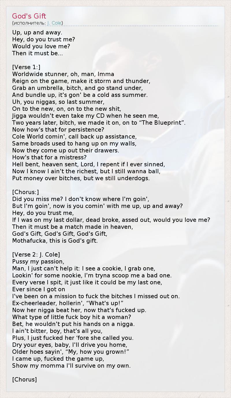Up, up and away. Hey, do you trust me? Would you love me? Then it must be... [Verse 1:] Worldwide stunner, oh, man, Imma Reign on the game, make it storm and thunder, Grab an umbrella, bitch, and go stand under, And bundle up, it's gon' be a cold ass summer. Uh, you niggas, so last summer, On to the new, on, on to the new shit, Jigga wouldn't even take my CD when he seen me, Two years later, bitch, we made it on, on to “The Blueprint”. Now how's that for persistence? Cole World comin', call back up assistance, Same broads used to hang up on my walls, Now they come up out their drawers. How's that for a mistress? Hell bent, heaven sent, Lord, I repent if I ever sinned, Now I know I ain't the richest, but I still wanna ball, Put money over bitches, but we still underdogs. [Chorus:] Did you miss me? I don't know where I'm goin', But I'm goin', now is you comin' with me up, up and away? Hey, do you trust me, If I was on my last dollar, dead broke, assed out, would you love me? Then it must be a match made in heaven, God's Gift, God's Gift, God's Gift, Mothafucka, this is God's gift. [Verse 2: J. Cole] Pussy my passion, Man, I just can't help it: I see a cookie, I grab one, Lookin' for some nookie, I'm tryna scoop me a bad one. Every verse I spit, it just like it could be my last one, Ever since I got on I've been on a mission to fuck the bitches I missed out on. Ex-cheerleader, hollerin', “What's up!” Now her nigga beat her, now that's fucked up. What type of little fuck boy hit a woman? Bet, he wouldn't put his hands on a nigga. I ain't bitter, boy, that's all you, Plus, I just fucked her ‘fore she called you. Dry your eyes, baby, I'll drive you home, Older hoes sayin', “My, how you grown!” I came up, fucked the game up, Show my momma I'll survive on my own. [Chorus]