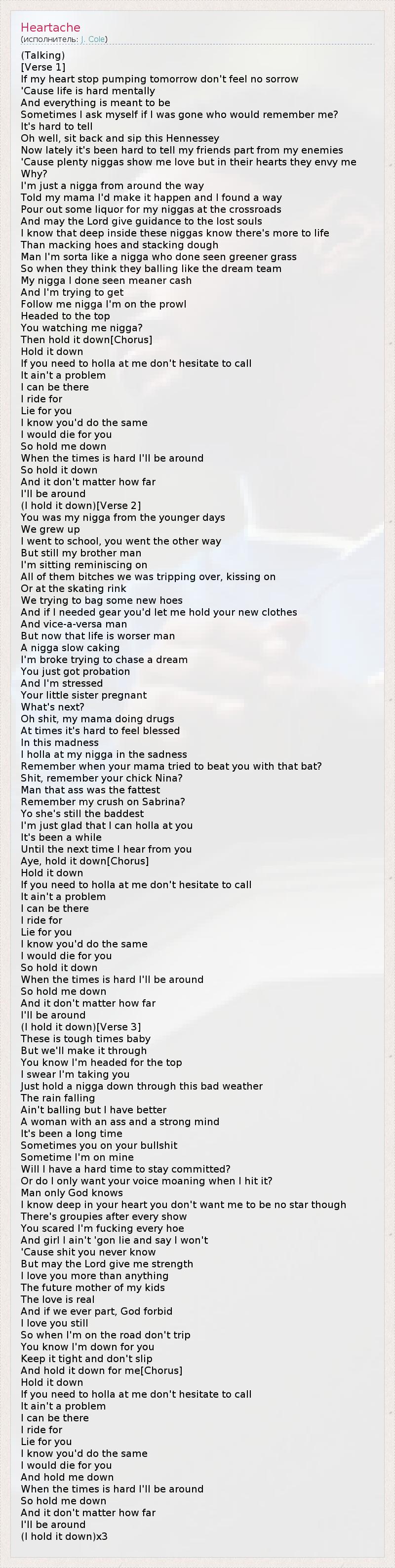 (Talking) [Verse 1] If my heart stop pumping tomorrow don't feel no sorrow 'Cause life is hard mentally And everything is meant to be Sometimes I ask myself if I was gone who would remember me? It's hard to tell Oh well, sit back and sip this Hennessey Now lately it's been hard to tell my friends part from my enemies 'Cause plenty niggas show me love but in their hearts they envy me Why? I'm just a nigga from around the way Told my mama I'd make it happen and I found a way Pour out some liquor for my niggas at the crossroads And may the Lord give guidance to the lost souls I know that deep inside these niggas know there's more to life Than macking hoes and stacking dough Man I'm sorta like a nigga who done seen greener grass So when they think they balling like the dream team My nigga I done seen meaner cash And I'm trying to get Follow me nigga I'm on the prowl Headed to the top You watching me nigga? Then hold it down[Chorus] Hold it down If you need to holla at me don't hesitate to call It ain't a problem I can be there I ride for Lie for you I know you'd do the same I would die for you So hold me down When the times is hard I'll be around So hold it down And it don't matter how far I'll be around (I hold it down)[Verse 2] You was my nigga from the younger days We grew up I went to school, you went the other way But still my brother man I'm sitting reminiscing on All of them bitches we was tripping over, kissing on Or at the skating rink We trying to bag some new hoes And if I needed gear you'd let me hold your new clothes And vice-a-versa man But now that life is worser man A nigga slow caking I'm broke trying to chase a dream You just got probation And I'm stressed Your little sister pregnant What's next? Oh shit, my mama doing drugs At times it's hard to feel blessed In this madness I holla at my nigga in the sadness Remember when your mama tried to beat you with that bat? Shit, remember your chick Nina? Man that ass was the fattest Remember my crush on Sabrina? Yo she's still the baddest I'm just glad that I can holla at you It's been a while Until the next time I hear from you Aye, hold it down[Chorus] Hold it down If you need to holla at me don't hesitate to call It ain't a problem I can be there I ride for Lie for you I know you'd do the same I would die for you So hold it down When the times is hard I'll be around So hold me down And it don't matter how far I'll be around (I hold it down)[Verse 3] These is tough times baby But we'll make it through You know I'm headed for the top I swear I'm taking you Just hold a nigga down through this bad weather The rain falling Ain't balling but I have better A woman with an ass and a strong mind It's been a long time Sometimes you on your bullshit Sometime I'm on mine Will I have a hard time to stay committed? Or do I only want your voice moaning when I hit it? Man only God knows I know deep in your heart you don't want me to be no star though There's groupies after every show You scared I'm fucking every hoe And girl I ain't 'gon lie and say I won't 'Cause shit you never know But may the Lord give me strength I love you more than anything The future mother of my kids The love is real And if we ever part, God forbid I love you still So when I'm on the road don't trip You know I'm down for you Keep it tight and don't slip And hold it down for me[Chorus] Hold it down If you need to holla at me don't hesitate to call It ain't a problem I can be there I ride for Lie for you I know you'd do the same I would die for you And hold me down When the times is hard I'll be around So hold me down And it don't matter how far I'll be around (I hold it down)x3