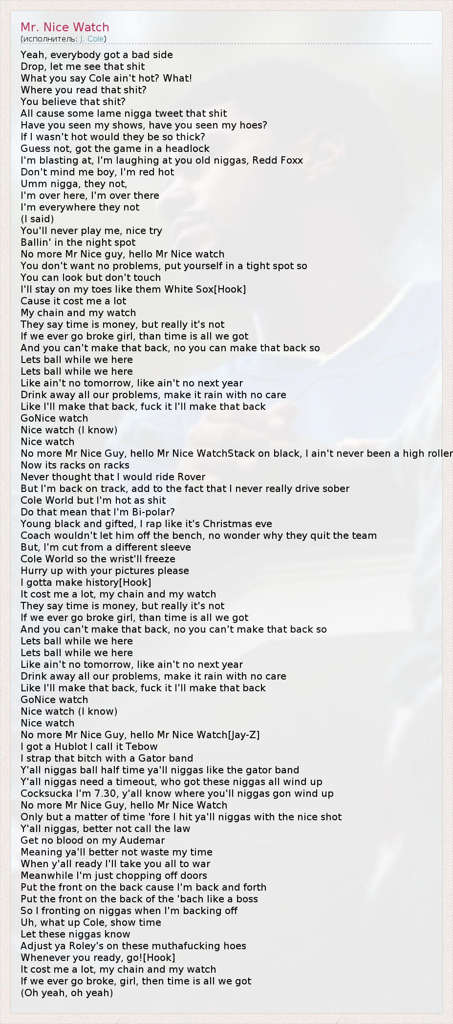 Yeah, everybody got a bad side Drop, let me see that shit What you say Cole ain't hot? What! Where you read that shit? You believe that shit? All cause some lame nigga tweet that shit Have you seen my shows, have you seen my hoes? If I wasn't hot would they be so thick? Guess not, got the game in a headlock I'm blasting at, I'm laughing at you old niggas, Redd Foxx Don't mind me boy, I'm red hot Umm nigga, they not, I'm over here, I'm over there I'm everywhere they not (I said) You'll never play me, nice try Ballin' in the night spot No more Mr Nice guy, hello Mr Nice watch You don't want no problems, put yourself in a tight spot so You can look but don't touch I'll stay on my toes like them White Sox[Hook] Cause it cost me a lot My chain and my watch They say time is money, but really it's not If we ever go broke girl, than time is all we got And you can't make that back, no you can make that back so Lets ball while we here Lets ball while we here Like ain't no tomorrow, like ain't no next year Drink away all our problems, make it rain with no care Like I'll make that back, fuck it I'll make that back GoNice watch Nice watch (I know) Nice watch No more Mr Nice Guy, hello Mr Nice WatchStack on black, I ain't never been a high roller Now its racks on racks Never thought that I would ride Rover But I'm back on track, add to the fact that I never really drive sober Cole World but I'm hot as shit Do that mean that I'm Bi-polar? Young black and gifted, I rap like it's Christmas eve Coach wouldn't let him off the bench, no wonder why they quit the team But, I'm cut from a different sleeve Cole World so the wrist'll freeze Hurry up with your pictures please I gotta make history[Hook] It cost me a lot, my chain and my watch They say time is money, but really it's not If we ever go broke girl, than time is all we got And you can't make that back, no you can't make that back so Lets ball while we here Lets ball while we here Like ain't no tomorrow, like ain't no next year Drink away all our problems, make it rain with no care Like I'll make that back, fuck it I'll make that back GoNice watch Nice watch (I know) Nice watch No more Mr Nice Guy, hello Mr Nice Watch[Jay-Z] I got a Hublot I call it Tebow I strap that bitch with a Gator band Y'all niggas ball half time ya'll niggas like the gator band Y'all niggas need a timeout, who got these niggas all wind up Cocksucka I'm 7.30, y'all know where you'll niggas gon wind up No more Mr Nice Guy, hello Mr Nice Watch Only but a matter of time 'fore I hit ya'll niggas with the nice shot Y'all niggas, better not call the law Get no blood on my Audemar Meaning ya'll better not waste my time When y'all ready I'll take you all to war Meanwhile I'm just chopping off doors Put the front on the back cause I'm back and forth Put the front on the back of the 'bach like a boss So I fronting on niggas when I'm backing off Uh, what up Cole, show time Let these niggas know Adjust ya Roley's on these muthafucking hoes Whenever you ready, go![Hook] It cost me a lot, my chain and my watch If we ever go broke, girl, then time is all we got (Oh yeah, oh yeah)