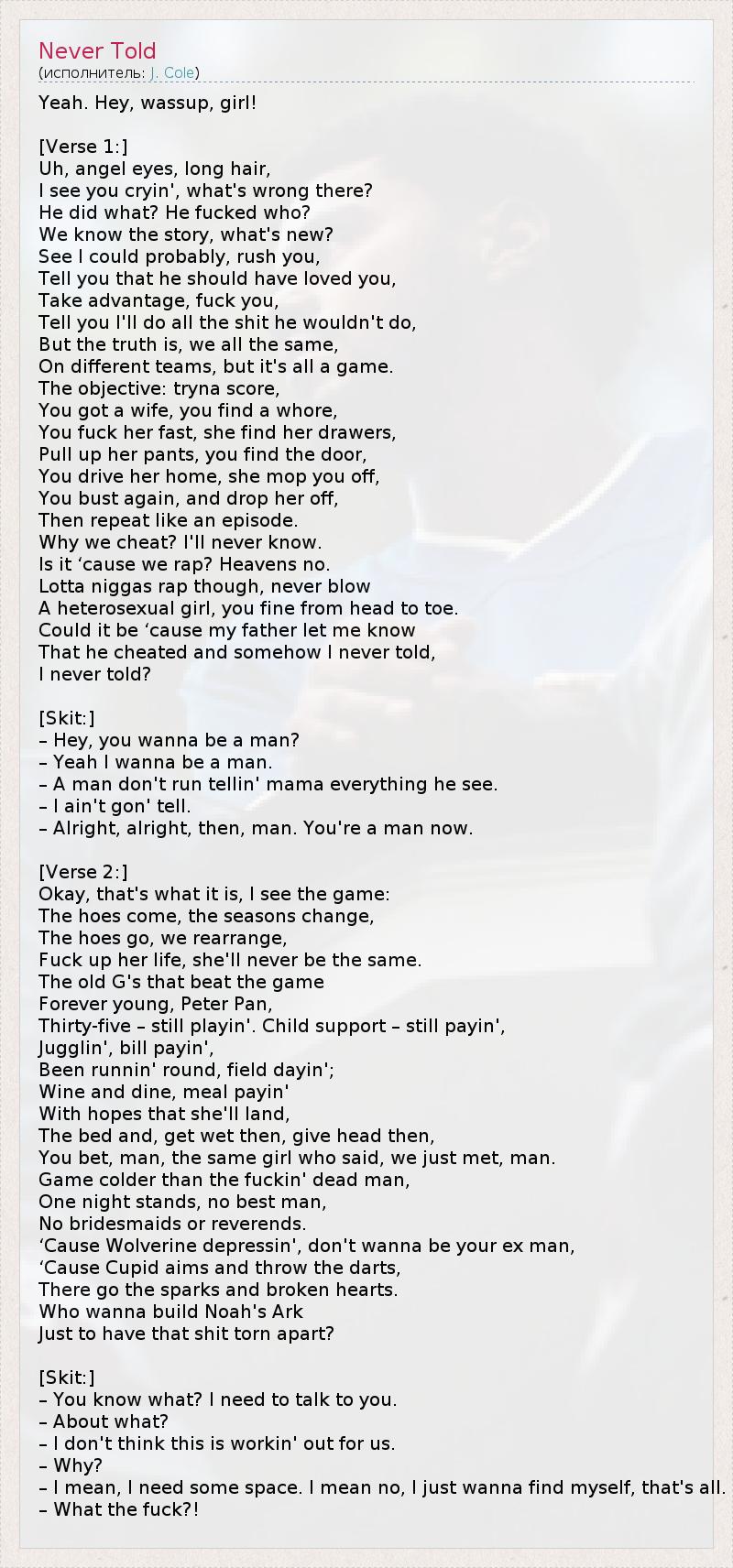 Ага. Эй, детка, как дела? [Куплет 1:] Ангельский взгляд, длинные волосы... Ты плачешь, что стряслось? Что он сделал? С кем он переспал? История стара, как мир, ведь ничего нового? Я бы мог уже лететь к тебе, Говорить, что он не должен был изменять тебе, Потом воспользоваться моментом и завалить тебя, А после твердить, что сделаю всё, чего не сделал он, Но правда жизни в том, что все мы одинаковы, Мы в разных командах, но игра-то одна. Есть цель – увеличивать счёт, Если есть жена, то найди любовницу: Тр**нул её по-быстрому, потом она одевается, Ты провожаешь её, А пока везешь домой, она снова со**т тебе, Ты снова кончаешь и, наконец, высаживаешь её, И это повторяется с завидной регулярностью. Почему мы изменяем? Мне этого никогда не узнать. Потому что мы читаем рэп? Нет, конечно. Куча черномазых занимается этим, но им не от**сывают Гетеросексуальные девчонки, прекрасные с головы до пят. Может, это потому, что отец говорил мне, Что изменял, но я никогда не рассказывал об этом, Я никогда не рассказывал. [Скит:] – Эй, ты же хочешь стать настоящим мужчиной? – Да, хочу. – Так вот, мужчина не бежит к маме, чтобы рассказать всё, что увидел. – Я не буду. – Ну и молодец. Теперь ты мужчина. [Куплет 2:] Да, так вот всё и происходит, я вижу, что к чему: Шл**и сменяют друг друга, как времена года, А когда они уходят, мы находим новых, Но ты испортил ей жизнь, она уже не будет прежней. Старые гангстеры, которые всем заправляют, Остаются вечно молодыми, как Питер Пэн, 1 В тридцать пять? Всё по бабам. Содержать детей? Всё ещё по бабам, Всё суетится, чтобы оплачивать счета, Всё где-то носится, как на скачках; Ужин с вином, оплата по счёту, Надежда, что она останется, Постель, возбуждение, минет, Чел, спорим, что ты проделывал такое с девушкой, с которой только что познакомился. Сочувствия здесь столько же, сколько в мертвеце, Всё на одну ночь, нет шаферов, Подружек невесты или священников. Росомаха в депрессии, он не хочет снова становиться "экс", 2 Когда Купидон прицелился и выпустил стрелу, Остаются искры и разбитые сердца. Кому охота строить Ноев Ковчег, Который потом развалится? [Скит:] – Знаешь, мне надо поговорить с тобой. – О чём? – Я не думаю, что у нас получится. – Почему это? – Ну, понимаешь, мне нужна свобода. Нет, в том смысле, что я хочу найти себя, вот и всё. – Да какого х**?! 1 – Мальчик, который не хочет взрослеть и вечно остается юным; персонаж книг шотландского писателя сэра Джеймса Барри. 2 – Росомаха – вымышленный персонаж, супергерой Marvel Comics, член многих суперкоманд, включая Новых Мстителей Людей Икс (X по-английски читается как "экс", что омофонно приставке "ex-" – "бывший".)