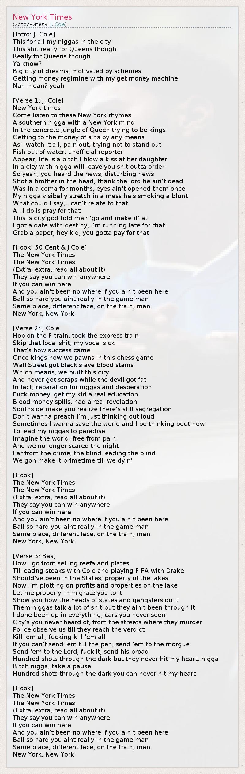 [Intro: J. Cole] This for all my niggas in the city This shit really for Queens though Really for Queens though Ya know? Big city of dreams, motivated by schemes Getting money regimine with my get money machine Nah mean? yeah [Verse 1: J, Cole] New York times Come listen to these New York rhymes A southern nigga with a New York mind In the concrete jungle of Queen trying to be kings Getting to the money of sins by any means As I watch it all, pain out, trying not to stand out Fish out of water, unofficial reporter Appear, life is a bitch I blow a kiss at her daughter In a city with nigga will leave you shit outta order So yeah, you heard the news, disturbing news Shot a brother in the head, thank the lord he ain't dead Was in a coma for months, eyes ain't opened them once My nigga visibally stretch in a mess he's smoking a blunt What could I say, I can't relate to that All I do is pray for that This is city god told me : 'go and make it' at I got a date with destiny, I'm running late for that Grab a paper, hey kid, you gotta pay for that [Hook: 50 Cent & J Cole] The New York Times The New York Times (Extra, extra, read all about it) They say you can win anywhere If you can win here And you ain't been no where if you ain't been here Ball so hard you aint really in the game man Same place, different face, on the train, man New York, New York [Verse 2: J Cole] Hop on the F train, took the express train Skip that local shit, my vocal sick That's how success came Once kings now we pawns in this chess game Wall Street got black slave blood stains Which means, we built this city And never got scraps while the devil got fat In fact, reparation for niggas and desperation Fuck money, get my kid a real education Blood money spills, had a real revelation Southside make you realize there's still segregation Don't wanna preach I'm just thinking out loud Sometimes I wanna save the world and I be thinking bout how To lead my niggas to paradise Imagine the world, free from pain And we no longer scared the night Far from the crime, the blind leading the blind We gon make it primetime till we dyin' [Hook] The New York Times The New York Times (Extra, extra, read all about it) They say you can win anywhere If you can win here And you ain't been no where if you ain't been here Ball so hard you aint really in the game man Same place, different face, on the train, man New York, New York [Verse 3: Bas] How I go from selling reefa and plates Till eating steaks with Cole and playing FIFA with Drake Should've been in the States, property of the Jakes Now I'm plotting on profits and properties on the lake Let me properly immigrate you to it Show you how the heads of states and gangsters do it Them niggas talk a lot of shit but they ain't been through it I done been up in everything, cars you never seen City's you never heard of, from the streets where they murder Police observe us till they reach the verdict Kill 'em all, fucking kill 'em all If you can't send 'em till the pen, send 'em to the morgue Send 'em to the Lord, fuck it, send his broad Hundred shots through the dark but they never hit my heart, nigga Bitch nigga, take a pause Hundred shots through the dark you can never hit my heart [Hook] The New York Times The New York Times (Extra, extra, read all about it) They say you can win anywhere If you can win here And you ain't been no where if you ain't been here Ball so hard you aint really in the game man Same place, different face, on the train, man New York, New York