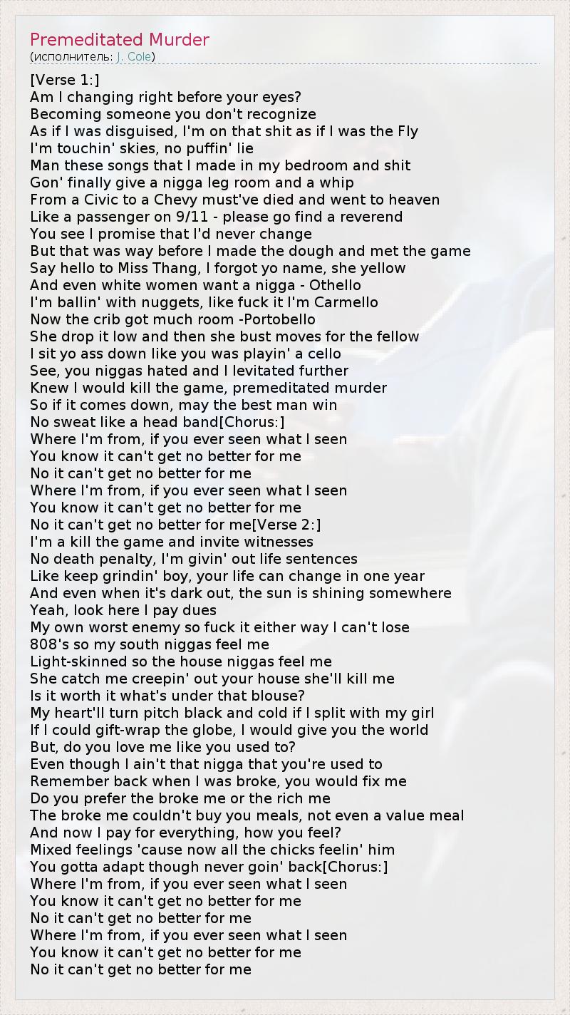 [Verse 1:] Am I changing right before your eyes? Becoming someone you don't recognize As if I was disguised, I'm on that shit as if I was the Fly I'm touchin' skies, no puffin' lie Man these songs that I made in my bedroom and shit Gon' finally give a nigga leg room and a whip From a Civic to a Chevy must've died and went to heaven Like a passenger on 9/11 - please go find a reverend You see I promise that I'd never change But that was way before I made the dough and met the game Say hello to Miss Thang, I forgot yo name, she yellow And even white women want a nigga - Othello I'm ballin' with nuggets, like fuck it I'm Carmello Now the crib got much room -Portobello She drop it low and then she bust moves for the fellow I sit yo ass down like you was playin' a cello See, you niggas hated and I levitated further Knew I would kill the game, premeditated murder So if it comes down, may the best man win No sweat like a head band[Chorus:] Where I'm from, if you ever seen what I seen You know it can't get no better for me No it can't get no better for me Where I'm from, if you ever seen what I seen You know it can't get no better for me No it can't get no better for me[Verse 2:] I'm a kill the game and invite witnesses No death penalty, I'm givin' out life sentences Like keep grindin' boy, your life can change in one year And even when it's dark out, the sun is shining somewhere Yeah, look here I pay dues My own worst enemy so fuck it either way I can't lose 808's so my south niggas feel me Light-skinned so the house niggas feel me She catch me creepin' out your house she'll kill me Is it worth it what's under that blouse? My heart'll turn pitch black and cold if I split with my girl If I could gift-wrap the globe, I would give you the world But, do you love me like you used to? Even though I ain't that nigga that you're used to Remember back when I was broke, you would fix me Do you prefer the broke me or the rich me The broke me couldn't buy you meals, not even a value meal And now I pay for everything, how you feel? Mixed feelings 'cause now all the chicks feelin' him You gotta adapt though never goin' back[Chorus:] Where I'm from, if you ever seen what I seen You know it can't get no better for me No it can't get no better for me Where I'm from, if you ever seen what I seen You know it can't get no better for me No it can't get no better for me