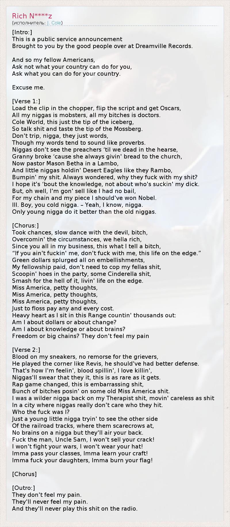 [Intro:] This is a public service announcement Brought to you by the good people over at Dreamville Records. And so my fellow Americans, Ask not what your country can do for you, Ask what you can do for your country. Excuse me. [Verse 1:] Load the clip in the chopper, flip the script and get Oscars, All my niggas is mobsters, all my bitches is doctors. Cole World, this just the tip of the iceberg, So talk shit and taste the tip of the Mossberg. Don't trip, nigga, they just words, Though my words tend to sound like proverbs. Niggas don't see the preachers ‘til we dead in the hearse, Granny broke ‘cause she always givin' bread to the church, Now pastor Mason Betha in a Lambo, And little niggas holdin' Desert Eagles like they Rambo, Bumpin' my shit. Always wondered, why they fuck with my shit? I hope it's ‘bout the knowledge, not about who's suckin' my dick. But, oh well, I'm gon' sell like I had no bail, For my chain and my piece I should've won Nobel. Ill. Boy, you cold nigga. – Yeah, I know, nigga. Only young nigga do it better than the old niggas. [Chorus:] Took chances, slow dance with the devil, bitch, Overcomin' the circumstances, we hella rich, Since you all in my business, this what I tell a bitch, “If you ain't fuckin' me, don't fuck with me, this life on the edge.” Green dollars splurged all on embellishments, My fellowship paid, don't need to cop my fellas shit, Scoopin' hoes in the party, some Cinderella shit, Smash for the hell of it, livin' life on the edge. Miss America, petty thoughts, Miss America, petty thoughts, Miss America, petty thoughts, Just to floss pay any and every cost. Heavy heart as I sit in this Range countin' thousands out: Am I about dollars or about change? Am I about knowledge or about brains? Freedom or big chains? They don't feel my pain [Verse 2:] Blood on my sneakers, no remorse for the grievers, He played the corner like Revis, he should've had better defense. That's how I'm feelin', blood spillin', I love killin', Niggas'll swear that they it, this is as rare as it gets. Rap game changed, this is embarrassing shit, Bunch of bitches posin' on some old Miss America shit. I was a wilder nigga back on my Therapist shit, movin' careless as shit In a city where niggas really don't care who they hit. Who the fuck was I? Just a young little nigga tryin' to see the other side Of the railroad tracks, where them scarecrows at, No brains on a nigga but they'll air your back. Fuck the man, Uncle Sam, I won't sell your crack! I won't fight your wars, I won't wear your hat! Imma pass your classes, Imma learn your craft! Imma fuck your daughters, Imma burn your flag! [Chorus] [Outro:] They don't feel my pain. They'll never feel my pain. And they'll never play this shit on the radio.