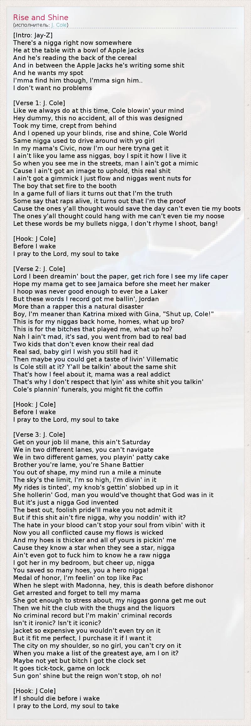 [Вступление: Jay-Z] 1 Где-то сейчас сидит нигер, За столом с миской овсяных колечек, И читает обратную сторону пачки, И между делом пописывает что-то. И хочет ко мне. Я все-таки найду его, и подпишу... Мне же не нужны проблемы. [Куплет 1: J. Cole] Как всегда в это время, Cole взрывает твое воображение, Эй, глупышка, это не совпадение, это все спланировано. Пришло мое время, и я подкрался сзади. Я раздвинул твои шторы, поднимайся и сияй, это мир Cole'a. Тот же нигер, который раньше катался по городу с твоей подругой В мамином Civic'е, а теперь я здесь пытаюсь получить свое. Я не похож на вас, жалкие нигеры, парень, я читаю о том, как живу, Так что когда увидишь меня на улицах, мне не нужно кому-то подражать, Потому что у меня нет образа для подражания, это так и есть. Мне не нужны уловки, я просто рифмую, и нигеры в восторге. Паренёк, изрыгающий огонь в кабине звукозаписи В игре, заполненной лжецами, оказывается, что я и есть правда. Говорят, рэп все еще жив, выходит, я тому доказательство, Потому что те, кто, по-вашему, спасет положение, даже не могут завязать мне шнурки. Те, кто, вы думали, будут мне коллегами, даже не могут завязать узел, как я 2. Пусть эти слова будут моими пулями, нигер, я не рифмую, я стреляю, бах! [Припев: J Cole] Перед тем, как проснусь, Я попрошу Господа принять мою душу. [Куплет 2: J. Cole] Боже, я мечтал о деньгах, о том, чтобы разбогатеть перед тем, как соскочу с жизни Надеюсь, моя мама увидит Ямайку перед тем, как встретит создателя Моя игра никогда не была достаточно хорошей, чтобы быть в составе Lakers Но слова, которые я записываю, держат меня в игре, Джордан Больше чем реппер, это стихийное бедствие Парень, я что-то среднее между Катриной и Джиной, "Закрой рот, Cole!" 3 Это для моих нигеров там, дома,- как ты, братишка? Это для с*чек, которые играли со мной, как ты, шлюха? Неет, я не зол, это грустно, - ты от "плохой" пришла действительно к дурному: Два малыша, которые даже не знают собственных отцов. В самом деле грустно, крошка, если бы ты была прежней, Тогда, возможно, у тебя бы возник вкус к жизни в стиле Villematic 4. Это Cole, все еще в деле. А вы все еще говорите о той же чепухе. Вот что я думаю на этот счёт, мама была настоящей наркоманкой, Вот почему я не уважаю ту лживую чушь о порошке, которую ты несешь. Cole планирует похороны, возможно, ты вместишься в гроб. [Припев: J Cole] Перед тем, как проснусь, Я попрошу Господа принять мою душу. [Куплет 3: J. Cole] Шагай на работу, паренек, сегодня не суббота, Мы на двух разных улицах, и ты не можешь сориентироваться. Мы в двух разных играх, и ты играешь в ладушки. Братишка, ты неумелый, ты Шейн Батье 5. Ты не в форме, моя мысль бежит со скоростью миля в минуту. Небо - предел, но я так высоко, я ныряю в него. Окна тонированные, мой чл*н изливается внутрь, Она кричит "О Боже", парень, ты наверное подумаешь, что именно Бог был в ней, Но Бог всего лишь сделал этого нигера. Бесспорно лучший, но глупая гордость не даст тебе признать это, Но если эта дрянь не огонь, так почему ты киваешь в ритм? Ненависть в твоей крови не станет преградой для того, чтобы откликнуться твоей душе, И теперь внутри вас конфликт, потому что мой стиль безумен, Мои тёлки сочнее, а все ваши выбирают меня, Так как они знают, кто звезда, когда видят её, нигер. Им даже не приходится его тр*хать, чтобы знать, что он суровый нигер. Она в моей постели, но не унывай, нигер, Ты спас так много шл*шек, ты герой, нигер! Медаль почет