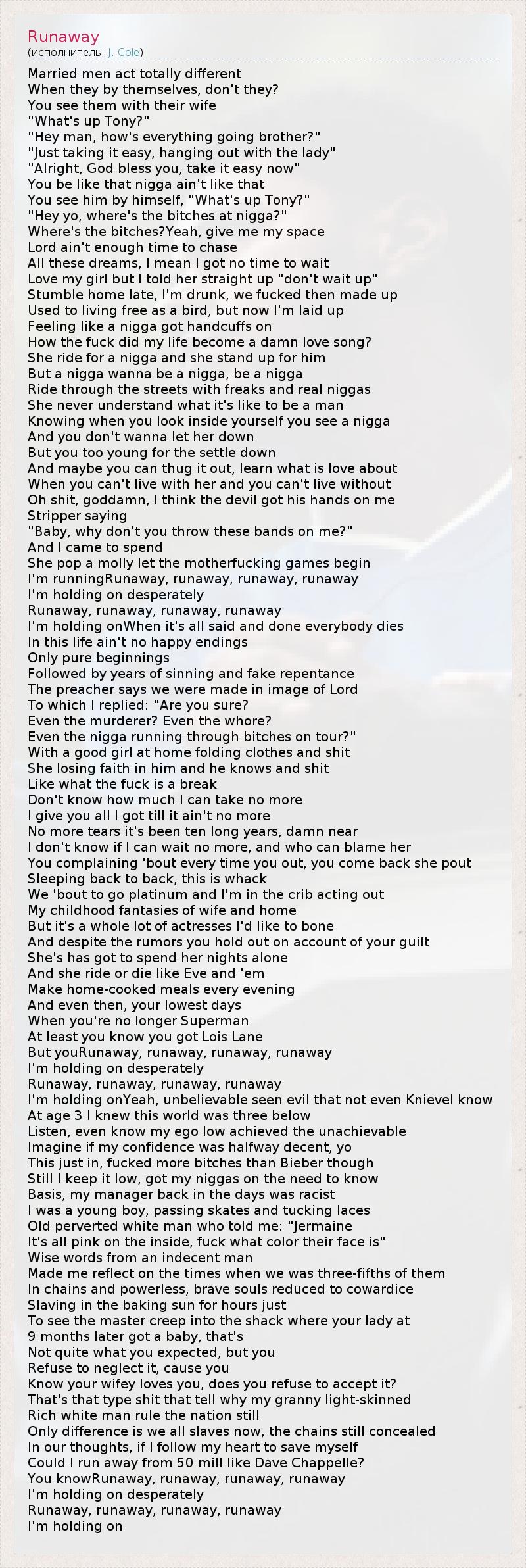 Married men act totally different When they by themselves, don't they? You see them with their wife "What's up Tony?" "Hey man, how's everything going brother?" "Just taking it easy, hanging out with the lady" "Alright, God bless you, take it easy now" You be like that nigga ain't like that You see him by himself, "What's up Tony?" "Hey yo, where's the bitches at nigga?" Where's the bitches?Yeah, give me my space Lord ain't enough time to chase All these dreams, I mean I got no time to wait Love my girl but I told her straight up "don't wait up" Stumble home late, I'm drunk, we fucked then made up Used to living free as a bird, but now I'm laid up Feeling like a nigga got handcuffs on How the fuck did my life become a damn love song? She ride for a nigga and she stand up for him But a nigga wanna be a nigga, be a nigga Ride through the streets with freaks and real niggas She never understand what it's like to be a man Knowing when you look inside yourself you see a nigga And you don't wanna let her down But you too young for the settle down And maybe you can thug it out, learn what is love about When you can't live with her and you can't live without Oh shit, goddamn, I think the devil got his hands on me Stripper saying "Baby, why don't you throw these bands on me?" And I came to spend She pop a molly let the motherfucking games begin I'm runningRunaway, runaway, runaway, runaway I'm holding on desperately Runaway, runaway, runaway, runaway I'm holding onWhen it's all said and done everybody dies In this life ain't no happy endings Only pure beginnings Followed by years of sinning and fake repentance The preacher says we were made in image of Lord To which I replied: "Are you sure? Even the murderer? Even the whore? Even the nigga running through bitches on tour?" With a good girl at home folding clothes and shit She losing faith in him and he knows and shit Like what the fuck is a break Don't know how much I can take no more I give you all I got till it ain't no more No more tears it's been ten long years, damn near I don't know if I can wait no more, and who can blame her You complaining 'bout every time you out, you come back she pout Sleeping back to back, this is whack We 'bout to go platinum and I'm in the crib acting out My childhood fantasies of wife and home But it's a whole lot of actresses I'd like to bone And despite the rumors you hold out on account of your guilt She's has got to spend her nights alone And she ride or die like Eve and 'em Make home-cooked meals every evening And even then, your lowest days When you're no longer Superman At least you know you got Lois Lane But youRunaway, runaway, runaway, runaway I'm holding on desperately Runaway, runaway, runaway, runaway I'm holding onYeah, unbelievable seen evil that not even Knievel know At age 3 I knew this world was three below Listen, even know my ego low achieved the unachievable Imagine if my confidence was halfway decent, yo This just in, fucked more bitches than Bieber though Still I keep it low, got my niggas on the need to know Basis, my manager back in the days was racist I was a young boy, passing skates and tucking laces Old perverted white man who told me: "Jermaine It's all pink on the inside, fuck what color their face is" Wise words from an indecent man Made me reflect on the times when we was three-fifths of them In chains and powerless, brave souls reduced to cowardice Slaving in the baking sun for hours just To see the master creep into the shack where your lady at 9 months later got a baby, that's Not quite what you expected, but you Refuse to neglect it, cause you Know your wifey loves you, does you refuse to accept it? That's that type shit that tell why my granny light-skinned Rich white man rule the nation still Only difference is we all slaves now, the chains still concealed In our thoughts, if I follow my heart to save myself Could I run away from 50 mill like Dave Chappelle? You knowRunaway, runaway, runaway, runaway I'm holding on desperately Runaway, runaway, runaway, runaway I'm holding on