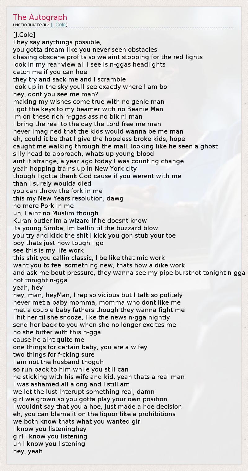 [J.Cole] They say anythings possible, you gotta dream like you never seen obstacles chasing obscene profits so we aint stopping for the red lights look in my rear view all I see is n-ggas headlights catch me if you can hoe they try and sack me and I scramble look up in the sky youll see exactly where I am bo hey, dont you see me man? making my wishes come true with no genie man I got the keys to my beamer with no Beanie Man Im on these rich n-ggas ass no bikini man I bring the real to the day the Lord free me man never imagined that the kids would wanna be me man eh, could it be that I give the hopeless broke kids, hope caught me walking through the mall, looking like he seen a ghost silly head to approach, whats up young blood aint it strange, a year ago today I was counting change yeah hopping trains up in New York city though I gotta thank God cause if you werent with me than I surely woulda died you can throw the fork in me this my New Years resolution, dawg no more Pork in me uh, I aint no Muslim though Kuran butler Im a wizard if he doesnt know its young Simba, Im ballin til the buzzard blow you try and kick the shit I kick you gon stub your toe boy thats just how tough I go see this is my life work this shit you callin classic, I be like that mic work want you to feel something new, thats how a dike work and ask me bout pressure, they wanna see my pipe burstnot tonight n-gga not tonight n-gga yeah, hey hey, man, heyMan, I rap so vicious but I talk so politely never met a baby momma, momma who dont like me met a couple baby fathers though they wanna fight me I hit her til she snooze, like the news n-gga nightly send her back to you when she no longer excites me no she bitter with this n-gga cause he aint quite me one things for certain baby, you are a wifey two things for f-cking sure I am not the husband thoguh so run back to him while you still can he sticking with his wife and kid, yeah thats a real man I was ashamed all along and I still am we let the lust interupt something real, damn girl we grown so you gotta play your own position I wouldnt say that you a hoe, just made a hoe decision eh, you can blame it on the liquor like a prohibitions we both know thats what you wanted girl I know you listeninghey girl I know you listening uh I know you listening hey, yeah
