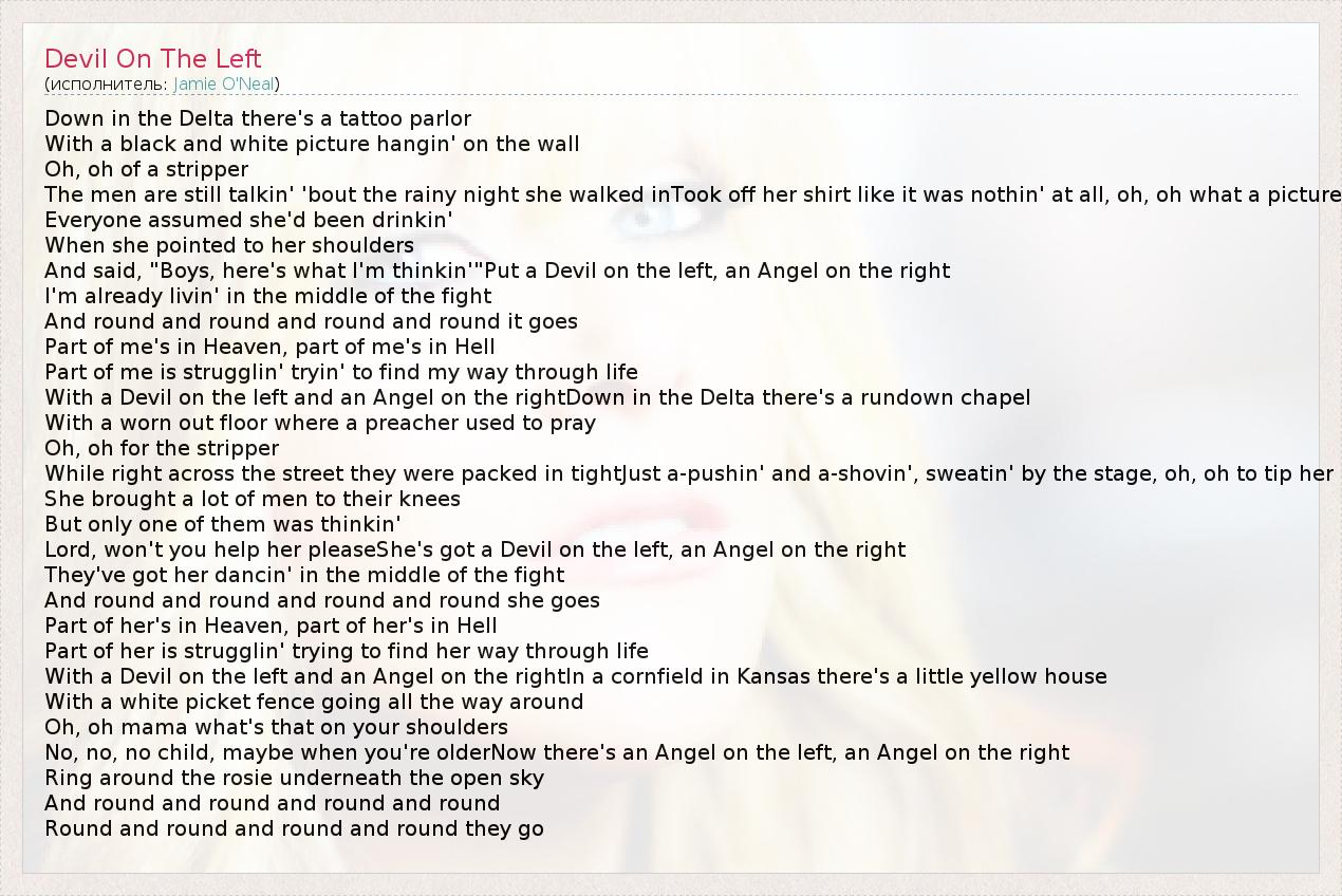Down in the Delta there's a tattoo parlor With a black and white picture hangin' on the wall Oh, oh of a stripper The men are still talkin' 'bout the rainy night she walked inTook off her shirt like it was nothin' at all, oh, oh what a picture Everyone assumed she'd been drinkin' When she pointed to her shoulders And said, "Boys, here's what I'm thinkin'"Put a Devil on the left, an Angel on the right I'm already livin' in the middle of the fight And round and round and round and round it goes Part of me's in Heaven, part of me's in Hell Part of me is strugglin' tryin' to find my way through life With a Devil on the left and an Angel on the rightDown in the Delta there's a rundown chapel With a worn out floor where a preacher used to pray Oh, oh for the stripper While right across the street they were packed in tightJust a-pushin' and a-shovin', sweatin' by the stage, oh, oh to tip her She brought a lot of men to their knees But only one of them was thinkin' Lord, won't you help her pleaseShe's got a Devil on the left, an Angel on the right They've got her dancin' in the middle of the fight And round and round and round and round she goes Part of her's in Heaven, part of her's in Hell Part of her is strugglin' trying to find her way through life With a Devil on the left and an Angel on the rightIn a cornfield in Kansas there's a little yellow house With a white picket fence going all the way around Oh, oh mama what's that on your shoulders No, no, no child, maybe when you're olderNow there's an Angel on the left, an Angel on the right Ring around the rosie underneath the open sky And round and round and round and round Round and round and round and round they go