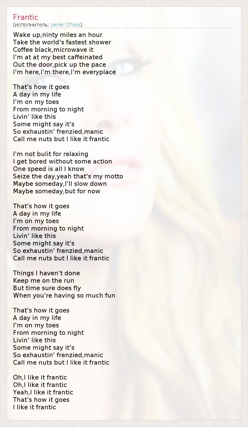 Wake up,ninty miles an hour Take the world's fastest shower Coffee black,microwave it I'm at at my best caffeinated Out the door,pick up the pace I'm here,I'm there,I'm everyplace That's how it goes A day in my life I'm on my toes From morning to night Livin' like this Some might say it's So exhaustin' frenzied,manic Call me nuts but I like it frantic I'm not bulit for relaxing I get bored without some action One speed is all I know Seize the day,yeah that's my motto Maybe someday,I'll slow down Maybe someday,but for now That's how it goes A day in my life I'm on my toes From morning to night Livin' like this Some might say it's So exhaustin' frenzied,manic Call me nuts but I like it frantic Things I haven't done Keep me on the run But time sure does fly When you're having so much fun That's how it goes A day in my life I'm on my toes From morning to night Livin' like this Some might say it's So exhaustin' frenzied,manic Call me nuts but I like it frantic Oh,I like it frantic Oh,I like it frantic Yeah,I like it frantic That's how it goes I like it frantic