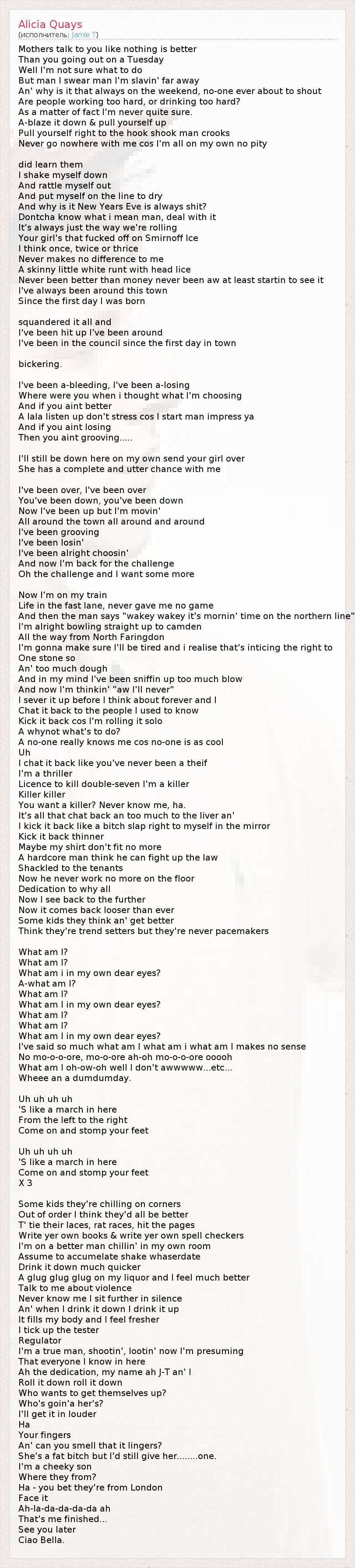 Mothers talk to you like nothing is better Than you going out on a Tuesday Well I'm not sure what to do But man I swear man I'm slavin' far away An' why is it that always on the weekend, no-one ever about to shout Are people working too hard, or drinking too hard? As a matter of fact I'm never quite sure. A-blaze it down & pull yourself up Pull yourself right to the hook shook man crooks Never go nowhere with me cos I'm all on my own no pity did learn them I shake myself down And rattle myself out And put myself on the line to dry And why is it New Years Eve is always shit? Dontcha know what i mean man, deal with it It's always just the way we're rolling Your girl's that fucked off on Smirnoff Ice I think once, twice or thrice Never makes no difference to me A skinny little white runt with head lice Never been better than money never been aw at least startin to see it I've always been around this town Since the first day I was born squandered it all and I've been hit up I've been around I've been in the council since the first day in town bickering. I've been a-bleeding, I've been a-losing Where were you when i thought what I'm choosing And if you aint better A lala listen up don't stress cos I start man impress ya And if you aint losing Then you aint grooving..... I'll still be down here on my own send your girl over She has a complete and utter chance with me I've been over, I've been over You've been down, you've been down Now I've been up but I'm movin' All around the town all around and around I've been grooving I've been losin' I've been alright choosin' And now I'm back for the challenge Oh the challenge and I want some more Now I'm on my train Life in the fast lane, never gave me no game And then the man says "wakey wakey it's mornin' time on the northern line" I'm alright bowling straight up to camden All the way from North Faringdon I'm gonna make sure I'll be tired and i realise that's inticing the right to One stone so An' too much dough And in my mind I've been sniffin up too much blow And now I'm thinkin' "aw I'll never" I sever it up before I think about forever and I Chat it back to the people I used to know Kick it back cos I'm rolling it solo A whynot what's to do? A no-one really knows me cos no-one is as cool Uh I chat it back like you've never been a theif I'm a thriller Licence to kill double-seven I'm a killer Killer killer You want a killer? Never know me, ha. It's all that chat back an too much to the liver an' I kick it back like a bitch slap right to myself in the mirror Kick it back thinner Maybe my shirt don't fit no more A hardcore man think he can fight up the law Shackled to the tenants Now he never work no more on the floor Dedication to why all Now I see back to the further Now it comes back looser than ever Some kids they think an' get better Think they're trend setters but they're never pacemakers What am I? What am I? What am i in my own dear eyes? A-what am I? What am I? What am I in my own dear eyes? What am I? What am I? What am I in my own dear eyes? I've said so much what am I what am i what am I makes no sense No mo-o-o-ore, mo-o-ore ah-oh mo-o-o-ore ooooh What am I oh-ow-oh well I don't awwwww...etc... Wheee an a dumdumday. Uh uh uh uh 'S like a march in here From the left to the right Come on and stomp your feet Uh uh uh uh 'S like a march in here Come on and stomp your feet X 3 Some kids they're chilling on corners Out of order I think they'd all be better T' tie their laces, rat races, hit the pages Write yer own books & write yer own spell checkers I'm on a better man chillin' in my own room Assume to accumelate shake whaserdate Drink it down much quicker A glug glug glug on my liquor and I feel much better Talk to me about violence Never know me I sit further in silence An' when I drink it down I drink it up It fills my body and I feel fresher I tick up the tester Regulator I'm a true man, shootin', lootin' now I'm presuming That everyone I know in here Ah the dedication, my name ah J-T an' I Roll it down roll it down Who wants to get themselves up? Who's goin'a her's? I'll get it in louder Ha Your fingers An' can you smell that it lingers? She's a fat bitch but I'd still give her........one. I'm a cheeky son Where they from? Ha - you bet they're from London Face it Ah-la-da-da-da-da ah That's me finished... See you later Ciao Bella.
