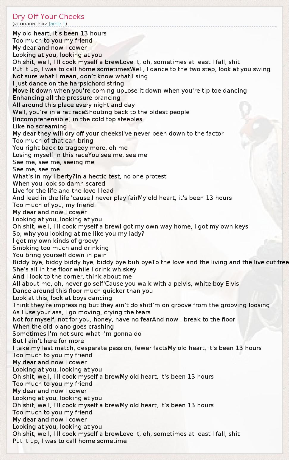 My old heart, it's been 13 hours Too much to you my friend My dear and now I cower Looking at you, looking at you Oh shit, well, I'll cook myself a brewLove it, oh, sometimes at least I fall, shit Put it up, I was to call home sometimesWell, I dance to the two step, look at you swing Not sure what I mean, don't know what I sing I just dance on the harpsichord string Move it down when you're coming upLose it down when you're tip toe dancing Enhancing all the pressure prancing All around this place every night and day Well, you're in a rat raceShouting back to the oldest people [Incomprehensible] in the cold top steeples Like no screaming My dear they will dry off your cheeksI've never been down to the factor Too much of that can bring You right back to tragedy more, oh me Losing myself in this raceYou see me, see me See me, see me, seeing me See me, see me What's in my liberty?In a hectic test, no one protest When you look so damn scared Live for the life and the love I lead And lead in the life 'cause I never play fairMy old heart, it's been 13 hours Too much of you, my friend My dear and now I cower Looking at you, looking at you Oh shit, well, I'll cook myself a brewI got my own way home, I got my own keys So, why you looking at me like you my lady? I got my own kinds of groovy Smoking too much and drinking You bring yourself down in pain Biddy bye, biddy biddy bye, biddy bye buh byeTo the love and the living and the live cut free She's all in the floor while I drink whiskey And I look to the corner, think about me All about me, oh, never go self'Cause you walk with a pelvis, white boy Elvis Dance around this floor much quicker than you Look at this, look at boys dancing Think they're impressing but they ain't do shitI'm on groove from the grooving loosing As I use your ass, I go moving, crying the tears Not for myself, not for you, honey, have no fearAnd now I break to the floor When the old piano goes crashing Sometimes I'm not sure what I'm gonna do But I ain't here for more I take my last match, desperate passion, fewer factsMy old heart, it's been 13 hours Too much to you my friend My dear and now I cower Looking at you, looking at you Oh shit, well, I'll cook myself a brewMy old heart, it's been 13 hours Too much to you my friend My dear and now I cower Looking at you, looking at you Oh shit, well, I'll cook myself a brewMy old heart, it's been 13 hours Too much to you my friend My dear and now I cower Looking at you, looking at you Oh shit, well, I'll cook myself a brewLove it, oh, sometimes at least I fall, shit Put it up, I was to call home sometime