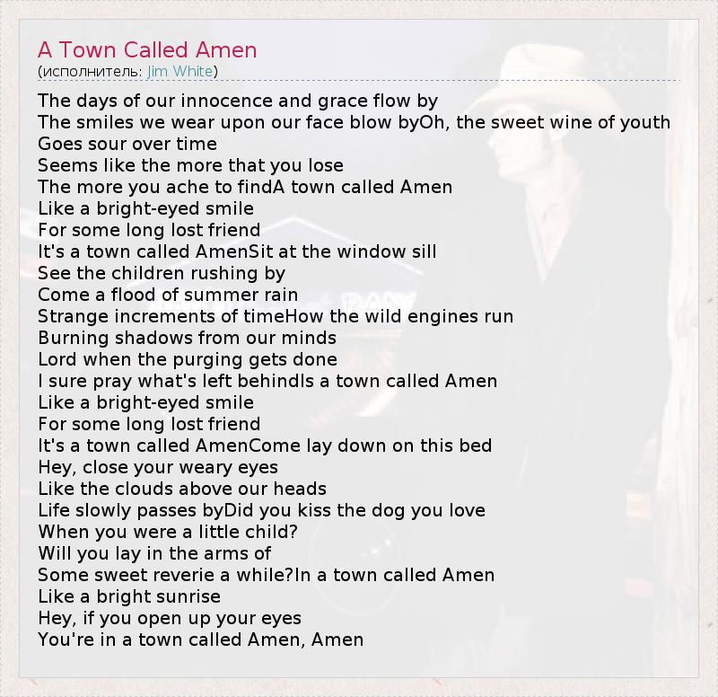 The days of our innocence and grace flow by The smiles we wear upon our face blow byOh, the sweet wine of youth Goes sour over time Seems like the more that you lose The more you ache to findA town called Amen Like a bright-eyed smile For some long lost friend It's a town called AmenSit at the window sill See the children rushing by Come a flood of summer rain Strange increments of timeHow the wild engines run Burning shadows from our minds Lord when the purging gets done I sure pray what's left behindIs a town called Amen Like a bright-eyed smile For some long lost friend It's a town called AmenCome lay down on this bed Hey, close your weary eyes Like the clouds above our heads Life slowly passes byDid you kiss the dog you love When you were a little child? Will you lay in the arms of Some sweet reverie a while?In a town called Amen Like a bright sunrise Hey, if you open up your eyes You're in a town called Amen, Amen