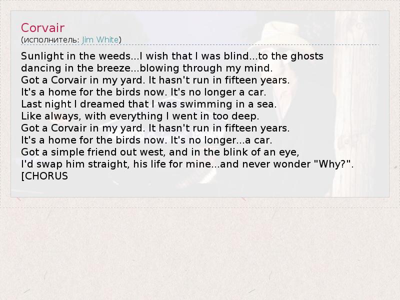 Sunlight in the weeds...I wish that I was blind...to the ghosts dancing in the breeze...blowing through my mind. Got a Corvair in my yard. It hasn't run in fifteen years. It's a home for the birds now. It's no longer a car. Last night I dreamed that I was swimming in a sea. Like always, with everything I went in too deep. Got a Corvair in my yard. It hasn't run in fifteen years. It's a home for the birds now. It's no longer...a car. Got a simple friend out west, and in the blink of an eye, I'd swap him straight, his life for mine...and never wonder "Why?". [CHORUS