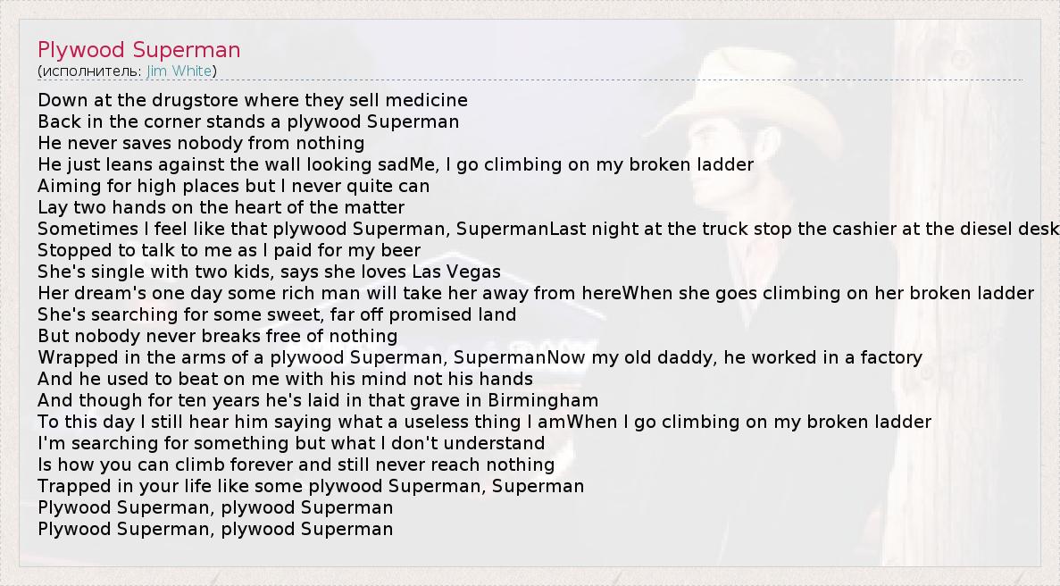 Down at the drugstore where they sell medicine Back in the corner stands a plywood Superman He never saves nobody from nothing He just leans against the wall looking sadMe, I go climbing on my broken ladder Aiming for high places but I never quite can Lay two hands on the heart of the matter Sometimes I feel like that plywood Superman, SupermanLast night at the truck stop the cashier at the diesel desk Stopped to talk to me as I paid for my beer She's single with two kids, says she loves Las Vegas Her dream's one day some rich man will take her away from hereWhen she goes climbing on her broken ladder She's searching for some sweet, far off promised land But nobody never breaks free of nothing Wrapped in the arms of a plywood Superman, SupermanNow my old daddy, he worked in a factory And he used to beat on me with his mind not his hands And though for ten years he's laid in that grave in Birmingham To this day I still hear him saying what a useless thing I amWhen I go climbing on my broken ladder I'm searching for something but what I don't understand Is how you can climb forever and still never reach nothing Trapped in your life like some plywood Superman, Superman Plywood Superman, plywood Superman Plywood Superman, plywood Superman