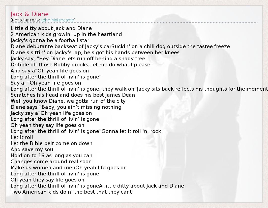 Little ditty about Jack and Diane 2 American kids growin' up in the heartland Jacky's gonna be a football star Diane debutante backseat of Jacky's carSuckin' on a chili dog outside the tastee freeze Diane's sittin' on Jacky's lap, he's got his hands between her knees Jacky say, "Hey Diane lets run off behind a shady tree Dribble off those Bobby brooks, let me do what I please" And say a"Oh yeah life goes on Long after the thrill of livin' is gone" Say a, "Oh yeah life goes on Long after the thrill of livin' is gone, they walk on"Jacky sits back reflects his thoughts for the moment Scratches his head and does his best James Dean Well you know Diane, we gotta run of the city Diane says "Baby, you ain't missing nothing Jacky say a"Oh yeah life goes on Long after the thrill of livin' is gone Oh yeah they say life goes on Long after the thrill of livin' is gone"Gonna let it roll 'n' rock Let it roll Let the Bible belt come on down And save my soul Hold on to 16 as long as you can Changes come around real soon Make us women and menOh yeah life goes on Long after the thrill of livin' is gone Oh yeah they say life goes on Long after the thrill of livin' is goneA little ditty about Jack and Diane Two American kids doin' the best that they cant