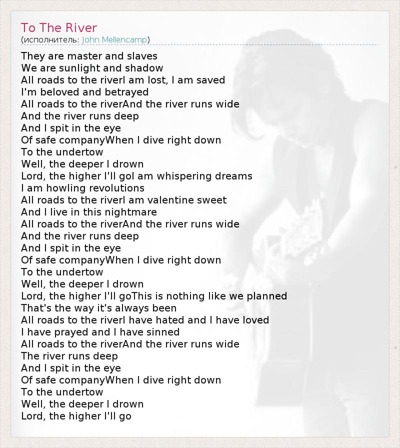 They are master and slaves We are sunlight and shadow All roads to the riverI am lost, I am saved I'm beloved and betrayed All roads to the riverAnd the river runs wide And the river runs deep And I spit in the eye Of safe companyWhen I dive right down To the undertow Well, the deeper I drown Lord, the higher I'll goI am whispering dreams I am howling revolutions All roads to the riverI am valentine sweet And I live in this nightmare All roads to the riverAnd the river runs wide And the river runs deep And I spit in the eye Of safe companyWhen I dive right down To the undertow Well, the deeper I drown Lord, the higher I'll goThis is nothing like we planned That's the way it's always been All roads to the riverI have hated and I have loved I have prayed and I have sinned All roads to the riverAnd the river runs wide The river runs deep And I spit in the eye Of safe companyWhen I dive right down To the undertow Well, the deeper I drown Lord, the higher I'll go