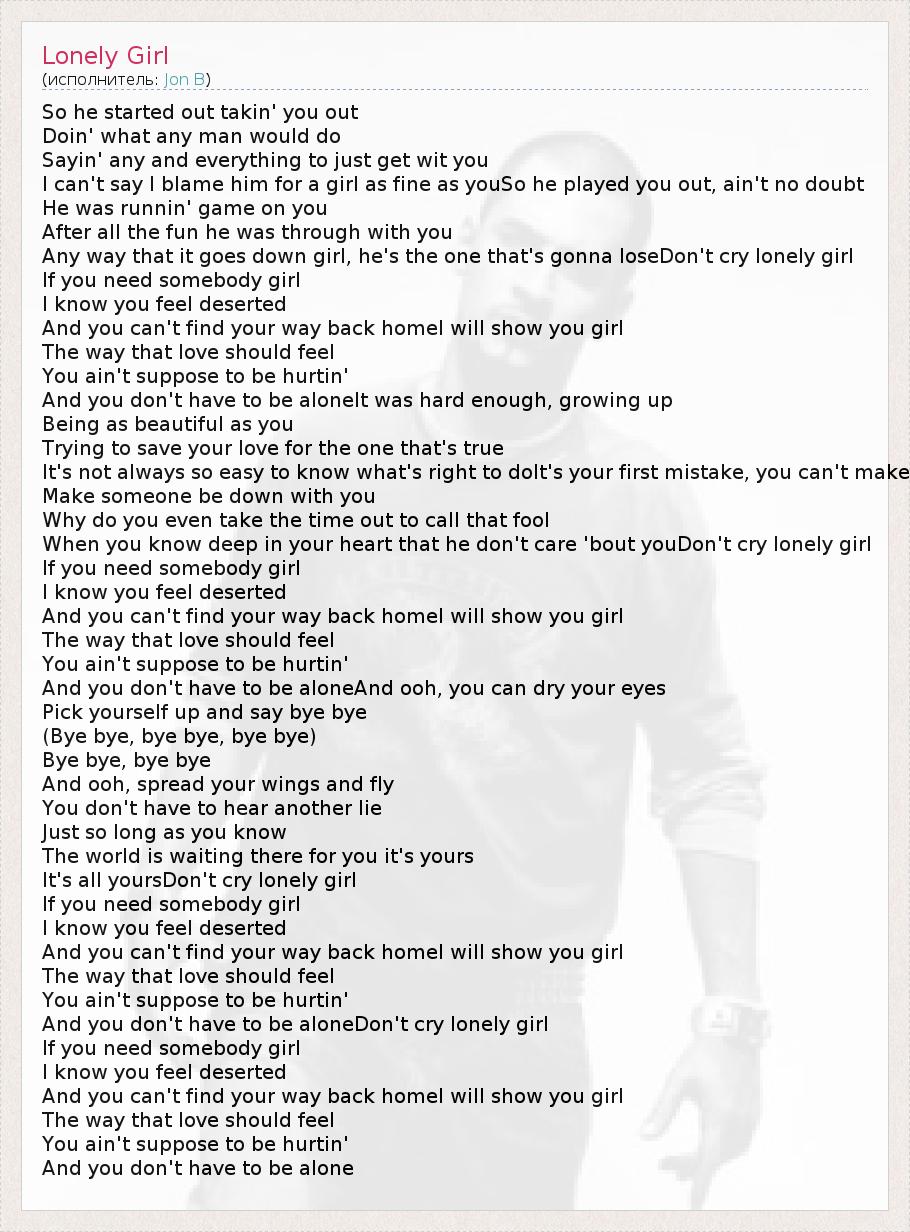 So he started out takin' you out Doin' what any man would do Sayin' any and everything to just get wit you I can't say I blame him for a girl as fine as youSo he played you out, ain't no doubt He was runnin' game on you After all the fun he was through with you Any way that it goes down girl, he's the one that's gonna loseDon't cry lonely girl If you need somebody girl I know you feel deserted And you can't find your way back homeI will show you girl The way that love should feel You ain't suppose to be hurtin' And you don't have to be aloneIt was hard enough, growing up Being as beautiful as you Trying to save your love for the one that's true It's not always so easy to know what's right to doIt's your first mistake, you can't make Make someone be down with you Why do you even take the time out to call that fool When you know deep in your heart that he don't care 'bout youDon't cry lonely girl If you need somebody girl I know you feel deserted And you can't find your way back homeI will show you girl The way that love should feel You ain't suppose to be hurtin' And you don't have to be aloneAnd ooh, you can dry your eyes Pick yourself up and say bye bye (Bye bye, bye bye, bye bye) Bye bye, bye bye And ooh, spread your wings and fly You don't have to hear another lie Just so long as you know The world is waiting there for you it's yours It's all yoursDon't cry lonely girl If you need somebody girl I know you feel deserted And you can't find your way back homeI will show you girl The way that love should feel You ain't suppose to be hurtin' And you don't have to be aloneDon't cry lonely girl If you need somebody girl I know you feel deserted And you can't find your way back homeI will show you girl The way that love should feel You ain't suppose to be hurtin' And you don't have to be alone