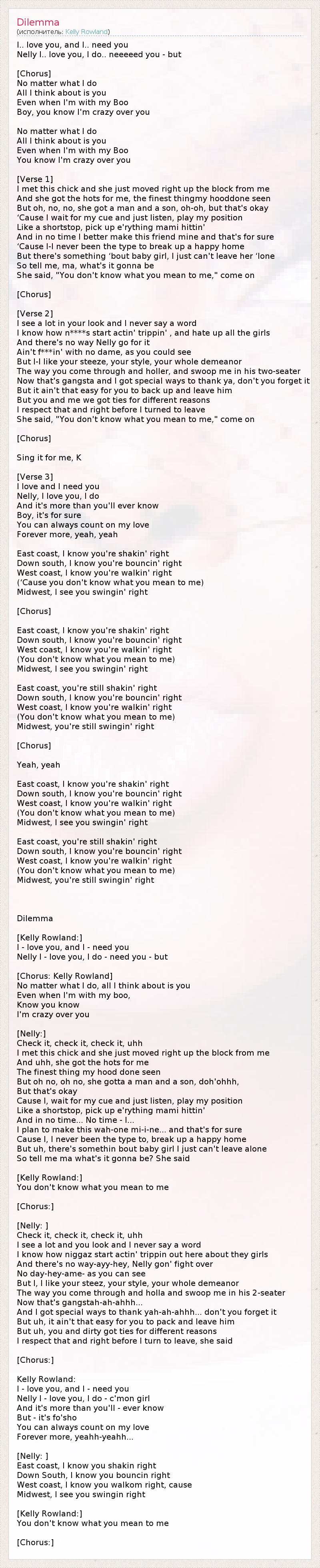Я... люблю тебя, ты... мне нужен. Нелли, я... люблю тебя, правда... нужен, но... [Припев:] Что бы я ни делала, Я думаю только о тебе. Даже когда я со своим любимым, Малыш, ты знаешь, я схожу по тебе с ума. Что бы я ни делала, Я думаю только о тебе. Даже когда я со своим любимым, Малыш, ты знаешь, я схожу по тебе с ума. [1-ый куплет:] Я встретил эту девушку, она как раз поселилась в квартале от меня. И она испытывает ко мне чувства – она самая прекрасная из тех, кого я встречал. Нет, нет, у неё есть муж и сын, но это ничего, Потому что я выжидаю, чтобы сделать ход – поставь себя на моё место. Я бы мог поступить нечестно, переспав с ней, Но я лучше стану ей другом, и это скорее всего, Потому что я не из тех, что разрушают чужое счастье. И всё же в этой малышке что-то есть... я не могу просто так отказаться от неё. "Скажи, малыш, как нам быть дальше?" И она ответила: "Ты не знаешь, что значишь для меня"... Поехали... [Припев:] [2-ой куплет:] Я многое читаю в твоём взгляде, но никогда не говорю ни слова. Я знаю, что ниг*еры играются с девушками, пользуются ими и при этом ненавидят. Я ни за что не стал бы так вести себя, Я не сплю, с кем попало, насколько тебе известно. Мне нравятся твои стиль и лёгкость, манера вести себя, Твои признания, ухаживания и попытки уложить меня в его двухместной легковушке. Но я гангстер, и по-особому отблагодарю тебя, запомни мои слова. Тебе нелегко взять и бросить его, Но нас с тобой очень многое связывает. Держа в голове всё это, я развернулся, чтобы уйти, Но она сказала: "Ты не знаешь, что значишь для меня"... Поехали... [Припев:] Спой для меня, Кей.... [3-ий куплет:] Я люблю тебя, ты мне нужен. Нелли, я люблю тебя, правда. Больше тебя никто так не полюбит, Будь в этом уверен, малыш. Ты можешь всегда рассчитывать на мою любовь, Вечно, да, да... Восточное побережье, я знаю, вы энергично двигаетесь... Далёкий юг, я знаю, вы вовсю зажигаете... Западное побережье, я знаю, вы гуляете на полную катушку... (Ты не знаешь, что значишь для меня...) Средний запад, я вижу, вы смачно отрываетесь... [Припев:] Восточное побережье, я знаю, вы энергично двигаетесь... Далёкий юг, я знаю, вы вовсю зажигаете... Западное побережье, я знаю, вы гуляете на полную катушку... (Ты не знаешь, что значишь для меня...) Средний запад, я вижу, вы смачно отрываетесь... Восточное побережье, я знаю, вы энергично двигаетесь... Далёкий юг, я знаю, вы вовсю зажигаете... Западное побережье, я знаю, вы гуляете на полную катушку... (Ты не знаешь, что значишь для меня...) Средний запад, я вижу, вы смачно отрываетесь... [Припев:] Да, да... Восточное побережье, я знаю, вы энергично двигаетесь... Далёкий юг, я знаю, вы вовсю зажигаете... Западное побережье, я знаю, вы гуляете на полную катушку... (Ты не знаешь, что значишь для меня...) Средний запад, я вижу, вы смачно отрываетесь... Восточное побережье, вы по-прежнему энергично двигаетесь... Далёкий юг, я знаю, вы вовсю зажигаете... Западное побережье, я знаю, вы гуляете на полную катушку... (Ты не знаешь, что значишь для меня...) Средний запад, вы по-прежнему смачно отрываетесь... Дилемма* (перевод Кристи из Москвы) [Kelly Rowland:] Я люблю тебя, и ты мне нужен Нелли, я люблю тебя- но- [Припев: Kelly Rowland] Все мысли только о тебе, Даже когда с другим я рядом Ты знаешь, я схожу с ума Молчи! Нам лишних слов не надо! [Nelly:] Раз-два, раз-два, раз-два Встретил её и мир перевернулся И, хм, я вижу, ей не всё равно Но нет, нет, нет, зачем же я проснулся?! Есть муж и сын, 