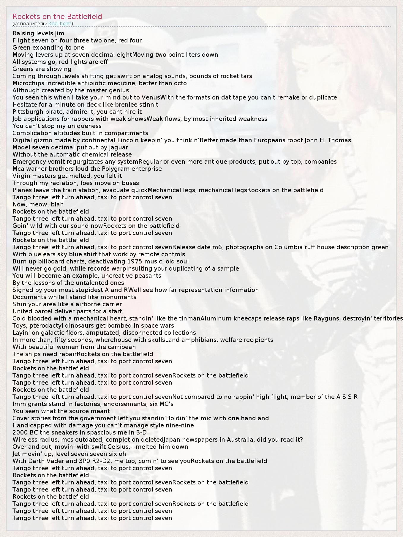 Raising levels Jim Flight seven oh four three two one, red four Green expanding to one Moving levers up at seven decimal eightMoving two point liters down All systems go, red lights are off Greens are showing Coming throughLevels shifting get swift on analog sounds, pounds of rocket tars Microchips incredible antibiotic medicine, better than octo Although created by the master genius You seen this when I take your mind out to VenusWith the formats on dat tape you can't remake or duplicate Hesitate for a minute on deck like brenlee stinnit Pittsburgh pirate, admire it, you cant hire it Job applications for rappers with weak showsWeak flows, by most inherited weakness You can't stop my uniqueness Complication altitudes built in compartments Digital gizmo made by continental Lincoln keepin' you thinkin'Better made than Europeans robot John H. Thomas Model seven decimal put out by jaguar Without the automatic chemical release Emergency vomit regurgitates any systemRegular or even more antique products, put out by top, companies Mca warner brothers loud the Polygram enterprise Virgin masters get melted, you felt it Through my radiation, foes move on buses Planes leave the train station, evacuate quickMechanical legs, mechanical legsRockets on the battlefield Tango three left turn ahead, taxi to port control seven Now, meow, blah Rockets on the battlefield Tango three left turn ahead, taxi to port control seven Goin' wild with our sound nowRockets on the battlefield Tango three left turn ahead, taxi to port control seven Rockets on the battlefield Tango three left turn ahead, taxi to port control sevenRelease date m6, photographs on Columbia ruff house description green With blue ears sky blue shirt that work by remote controls Burn up billboard charts, deactivating 1975 music, old soul Will never go gold, while records warpInsulting your duplicating of a sample You will become an example, uncreative peasants By the lessons of the untalented ones Signed by your most stupidest A and RWell see how far representation information Documents while I stand like monuments Stun your area like a airborne carrier United parcel deliver parts for a start Cold blooded with a mechanical heart, standin' like the tinmanAluminum kneecaps release raps like Rayguns, destroyin' territories Toys, pterodactyl dinosaurs get bombed in space wars Layin' on galactic floors, amputated, disconnected collections In more than, fifty seconds, wherehouse with skullsLand amphibians, welfare recipients With beautiful women from the carribean The ships need repairRockets on the battlefield Tango three left turn ahead, taxi to port control seven Rockets on the battlefield Tango three left turn ahead, taxi to port control sevenRockets on the battlefield Tango three left turn ahead, taxi to port control seven Rockets on the battlefield Tango three left turn ahead, taxi to port control sevenNot compared to no rappin' high flight, member of the A S S R Immigrants stand in factories, endorsements, six MC's You seen what the source meant Cover stories from the government left you standin'Holdin' the mic with one hand and Handicapped with damage you can't manage style nine-nine 2000 BC the sneakers in spascious me in 3-D Wireless radius, mcs outdated, completion deletedJapan newspapers in Australia, did you read it? Over and out, movin' with swift Celsius, I melted him down Jet movin' up, level seven seven six oh With Darth Vader and 3P0 R2-D2, me too, comin' to see youRockets on the battlefield Tango three left turn ahead, taxi to port control seven Rockets on the battlefield Tango three left turn ahead, taxi to port control sevenRockets on the battlefield Tango three left turn ahead, taxi to port control seven Rockets on the battlefield Tango three left turn ahead, taxi to port control sevenRockets on the battlefield Tango three left turn ahead, taxi to port control seven Tango three left turn ahead, taxi to port control seven