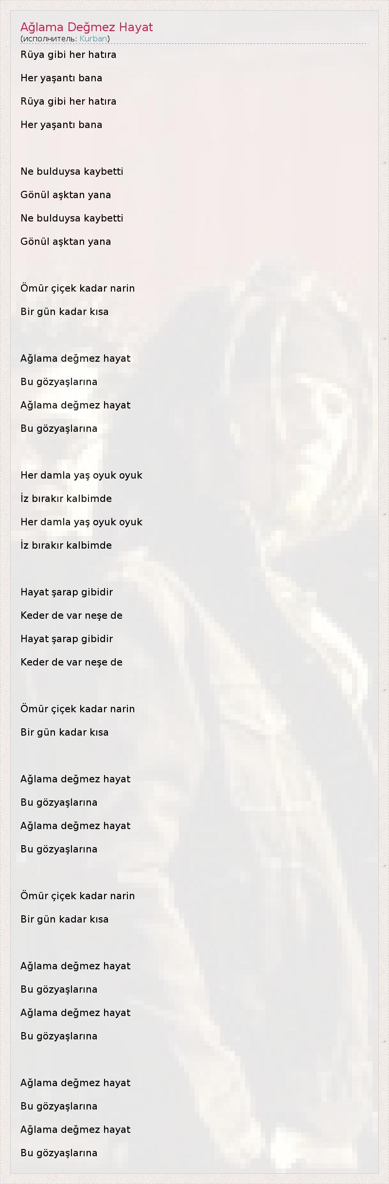 ГлавнаяИсполнителиKurbanAğlama Değmez Hayat