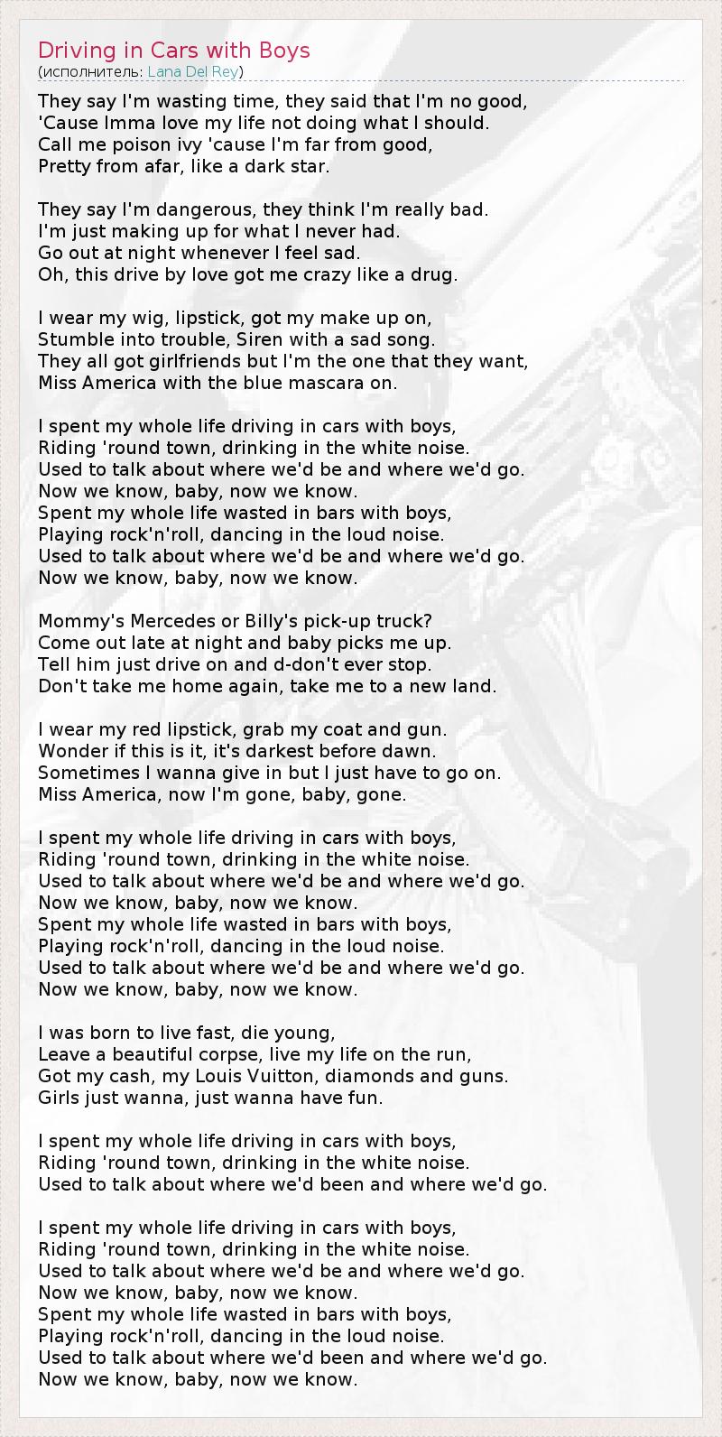 They say I'm wasting time, they said that I'm no good, 'Cause Imma love my life not doing what I should. Call me poison ivy 'cause I'm far from good, Pretty from afar, like a dark star. They say I'm dangerous, they think I'm really bad. I'm just making up for what I never had. Go out at night whenever I feel sad. Oh, this drive by love got me crazy like a drug. I wear my wig, lipstick, got my make up on, Stumble into trouble, Siren with a sad song. They all got girlfriends but I'm the one that they want, Miss America with the blue mascara on. I spent my whole life driving in cars with boys, Riding 'round town, drinking in the white noise. Used to talk about where we'd be and where we'd go. Now we know, baby, now we know. Spent my whole life wasted in bars with boys, Playing rock'n'roll, dancing in the loud noise. Used to talk about where we'd be and where we'd go. Now we know, baby, now we know. Mommy's Mercedes or Billy's pick-up truck? Come out late at night and baby picks me up. Tell him just drive on and d-don't ever stop. Don't take me home again, take me to a new land. I wear my red lipstick, grab my coat and gun. Wonder if this is it, it's darkest before dawn. Sometimes I wanna give in but I just have to go on. Miss America, now I'm gone, baby, gone. I spent my whole life driving in cars with boys, Riding 'round town, drinking in the white noise. Used to talk about where we'd be and where we'd go. Now we know, baby, now we know. Spent my whole life wasted in bars with boys, Playing rock'n'roll, dancing in the loud noise. Used to talk about where we'd be and where we'd go. Now we know, baby, now we know. I was born to live fast, die young, Leave a beautiful corpse, live my life on the run, Got my cash, my Louis Vuitton, diamonds and guns. Girls just wanna, just wanna have fun. I spent my whole life driving in cars with boys, Riding 'round town, drinking in the white noise. Used to talk about where we'd been and where we'd go. I spent my whole life driving in cars with boys, Riding 'round town, drinking in the white noise. Used to talk about where we'd be and where we'd go. Now we know, baby, now we know. Spent my whole life wasted in bars with boys, Playing rock'n'roll, dancing in the loud noise. Used to talk about where we'd been and where we'd go. Now we know, baby, now we know.