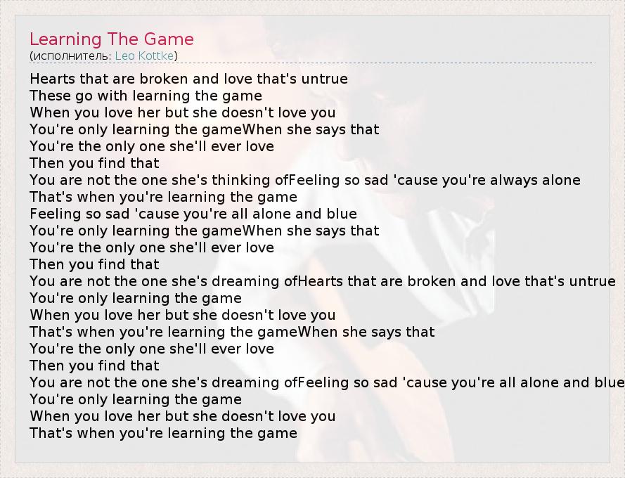 Hearts that are broken and love that's untrue These go with learning the game When you love her but she doesn't love you You're only learning the gameWhen she says that You're the only one she'll ever love Then you find that You are not the one she's thinking ofFeeling so sad 'cause you're always alone That's when you're learning the game Feeling so sad 'cause you're all alone and blue You're only learning the gameWhen she says that You're the only one she'll ever love Then you find that You are not the one she's dreaming ofHearts that are broken and love that's untrue You're only learning the game When you love her but she doesn't love you That's when you're learning the gameWhen she says that You're the only one she'll ever love Then you find that You are not the one she's dreaming ofFeeling so sad 'cause you're all alone and blue You're only learning the game When you love her but she doesn't love you That's when you're learning the game