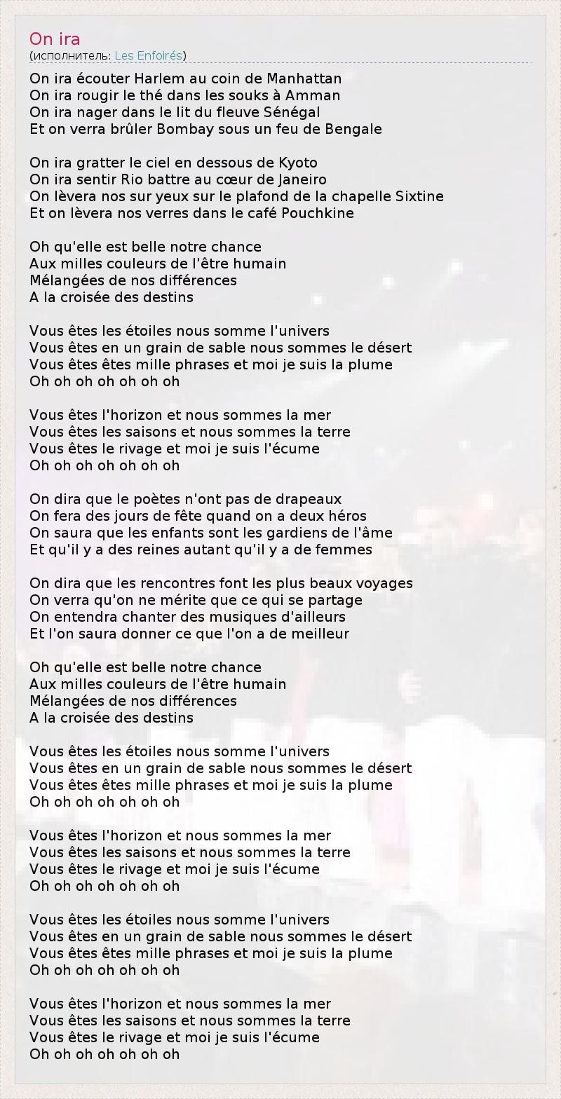 On ira écouter Harlem au coin de Manhattan On ira rougir le thé dans les souks à Amman On ira nager dans le lit du fleuve Sénégal Et on verra brûler Bombay sous un feu de Bengale On ira gratter le ciel en dessous de Kyoto On ira sentir Rio battre au cœur de Janeiro On lèvera nos sur yeux sur le plafond de la chapelle Sixtine Et on lèvera nos verres dans le café Pouchkine Oh qu'elle est belle notre chance Aux milles couleurs de l'être humain Mélangées de nos différences A la croisée des destins Vous êtes les étoiles nous somme l'univers Vous êtes en un grain de sable nous sommes le désert Vous êtes êtes mille phrases et moi je suis la plume Oh oh oh oh oh oh oh Vous êtes l'horizon et nous sommes la mer Vous êtes les saisons et nous sommes la terre Vous êtes le rivage et moi je suis l'écume Oh oh oh oh oh oh oh On dira que le poètes n'ont pas de drapeaux On fera des jours de fête quand on a deux héros On saura que les enfants sont les gardiens de l'âme Et qu'il y a des reines autant qu'il y a de femmes On dira que les rencontres font les plus beaux voyages On verra qu'on ne mérite que ce qui se partage On entendra chanter des musiques d'ailleurs Et l'on saura donner ce que l'on a de meilleur Oh qu'elle est belle notre chance Aux milles couleurs de l'être humain Mélangées de nos différences A la croisée des destins Vous êtes les étoiles nous somme l'univers Vous êtes en un grain de sable nous sommes le désert Vous êtes êtes mille phrases et moi je suis la plume Oh oh oh oh oh oh oh Vous êtes l'horizon et nous sommes la mer Vous êtes les saisons et nous sommes la terre Vous êtes le rivage et moi je suis l'écume Oh oh oh oh oh oh oh Vous êtes les étoiles nous somme l'univers Vous êtes en un grain de sable nous sommes le désert Vous êtes êtes mille phrases et moi je suis la plume Oh oh oh oh oh oh oh Vous êtes l'horizon et nous sommes la mer Vous êtes les saisons et nous sommes la terre Vous êtes le rivage et moi je suis l'écume Oh oh oh oh oh oh oh