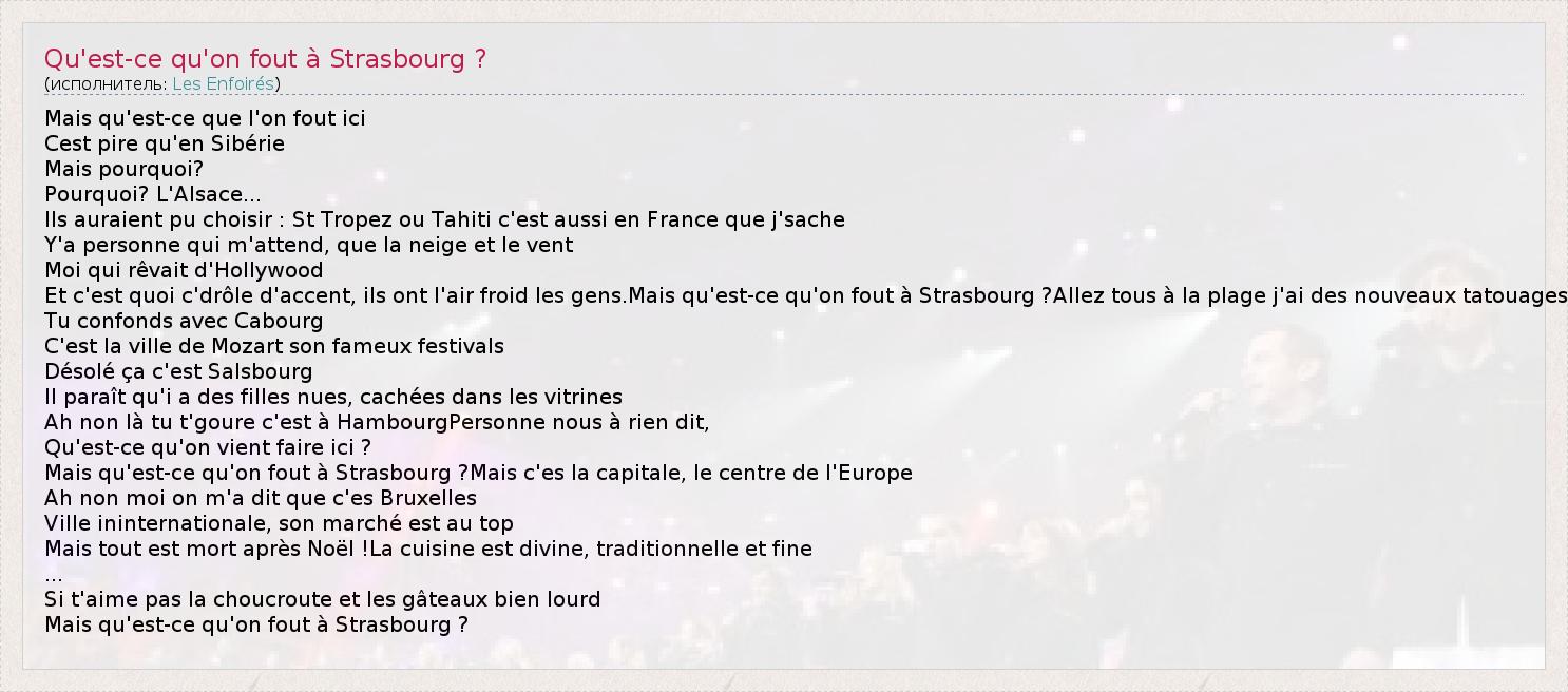 Mais qu'est-ce que l'on fout ici Cest pire qu'en Sibérie Mais pourquoi? Pourquoi? L'Alsace... Ils auraient pu choisir : St Tropez ou Tahiti c'est aussi en France que j'sache Y'a personne qui m'attend, que la neige et le vent Moi qui rêvait d'Hollywood Et c'est quoi c'drôle d'accent, ils ont l'air froid les gens.Mais qu'est-ce qu'on fout à Strasbourg ?Allez tous à la plage j'ai des nouveaux tatouages Tu confonds avec Cabourg C'est la ville de Mozart son fameux festivals Désolé ça c'est Salsbourg Il paraît qu'i a des filles nues, cachées dans les vitrines Ah non là tu t'goure c'est à HambourgPersonne nous à rien dit, Qu'est-ce qu'on vient faire ici ? Mais qu'est-ce qu'on fout à Strasbourg ?Mais c'es la capitale, le centre de l'Europe Ah non moi on m'a dit que c'es Bruxelles Ville ininternationale, son marché est au top Mais tout est mort après Noël !La cuisine est divine, traditionnelle et fine ... Si t'aime pas la choucroute et les gâteaux bien lourd Mais qu'est-ce qu'on fout à Strasbourg ?