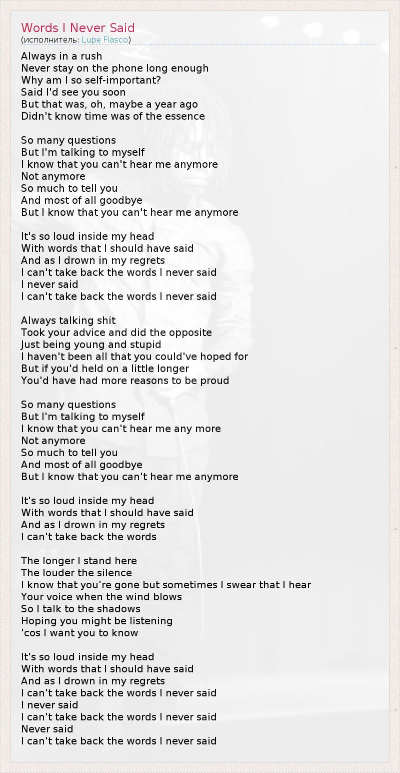 Вечно спешу, Некогда поговорить по телефону. Почему я такая заносчивая? Сказала тебе "Увидимся", Но это было, кажется, около года назад... Я не думала, что время настолько существенно. У меня столько вопросов, Но я задаю их самой себе. Я знаю, что ты больше меня не слышишь, Уже нет. Мне так много нужно тебе сказать, И больше всего - "Прощай". Но я знаю, что ты больше меня не слышишь. В моей голове крутятся слова, Которые я должна была сказать. И, утопая в сожалениях, Я не могу взять обратно те слова, Что никогда не были произнесены. Я не могу взять обратно те слова... Постоянно несла чушь, Внимала твоим советам и делала обратное. Я просто была юной и глупой, Ты не мог на меня надеяться. Но если бы ты еще немного продержался, Ты смог бы мной гордиться. У меня столько вопросов, Но я задаю их самой себе. Я знаю, что ты больше меня не слышишь, Уже нет. Мне так много нужно тебе сказать, И больше всего - "Прощай". Но я знаю, что ты больше меня не слышишь. В моей голове крутятся слова, Которые я должна была сказать. И, утопая в сожалениях, Я не могу взять обратно те слова... Чем дольше я нахожусь здесь, Тем громче звучит тишина. Я знаю, что ты ушел. Но, клянусь, В дуновении ветра я слышу твой голос. Я разговариваю с тенями, Надеясь, что ты услышишь меня. Я хочу, чтобы ты знал... В моей голове крутятся слова, Которые я должна была сказать. И, утопая в сожалениях, Я не могу взять обратно те слова, Что никогда не были произнесены... Я не могу взять обратно те слова, Что никогда не были произнесены, Я не могу взять обратно те слова, что никогда не были произнесены...