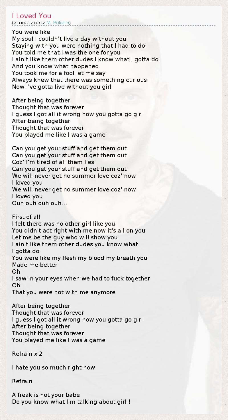 You were like My soul I couldn't live a day without you Staying with you were nothing that I had to do You told me that I was the one for you I ain't like them other dudes I know what I gotta do And you know what happened You took me for a fool let me say Always knew that there was something curious Now I've gotta live without you girl After being together Thought that was forever I guess I got all it wrong now you gotta go girl After being together Thought that was forever You played me like I was a game Can you get your stuff and get them out Can you get your stuff and get them out Coz' I'm tired of all them lies Can you get your stuff and get them out We will never get no summer love coz' now I loved you We will never get no summer love coz' now I loved you Ouh ouh ouh ouh… First of all I felt there was no other girl like you You didn't act right with me now it's all on you Let me be the guy who will show you I ain't like them other dudes you know what I gotta do You were like my flesh my blood my breath you Made me better Oh I saw in your eyes when we had to fuck together Oh That you were not with me anymore After being together Thought that was forever I guess I got all it wrong now you gotta go girl After being together Thought that was forever You played me like I was a game Refrain x 2 I hate you so much right now Refrain A freak is not your babe Do you know what I'm talking about girl !