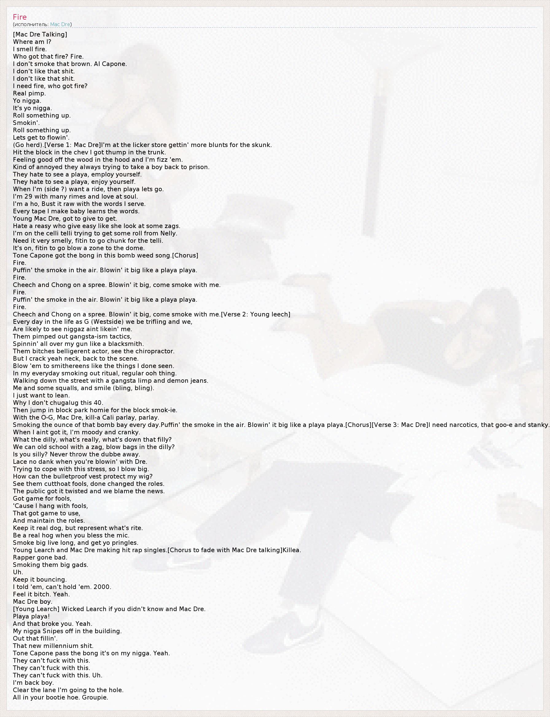Smoking the ounce of that bomb bay every day.Puffin' the smoke in the air. Blowin' it big like a playa playa.[Chorus][Verse 3: Mac Dre]I need narcotics, that goo-e and stanky.