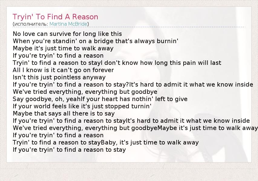 No love can survive for long like this When you're standin' on a bridge that's always burnin' Maybe it's just time to walk away If you're tryin' to find a reason Tryin' to find a reason to stayI don't know how long this pain will last All I know is it can't go on forever Isn't this just pointless anyway If you're tryin' to find a reason to stay?It's hard to admit it what we know inside We've tried everything, everything but goodbye Say goodbye, oh, yeahIf your heart has nothin' left to give If your world feels like it's just stopped turnin' Maybe that says all there is to say If you're tryin' to find a reason to stayIt's hard to admit it what we know inside We've tried everything, everything but goodbyeMaybe it's just time to walk away If you're tryin' to find a reason Tryin' to find a reason to stayBaby, it's just time to walk away If you're tryin' to find a reason to stay